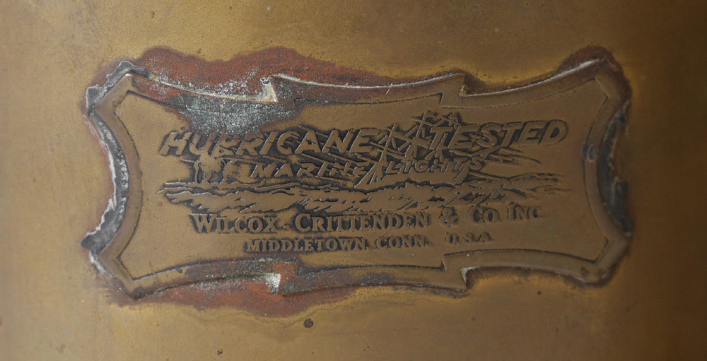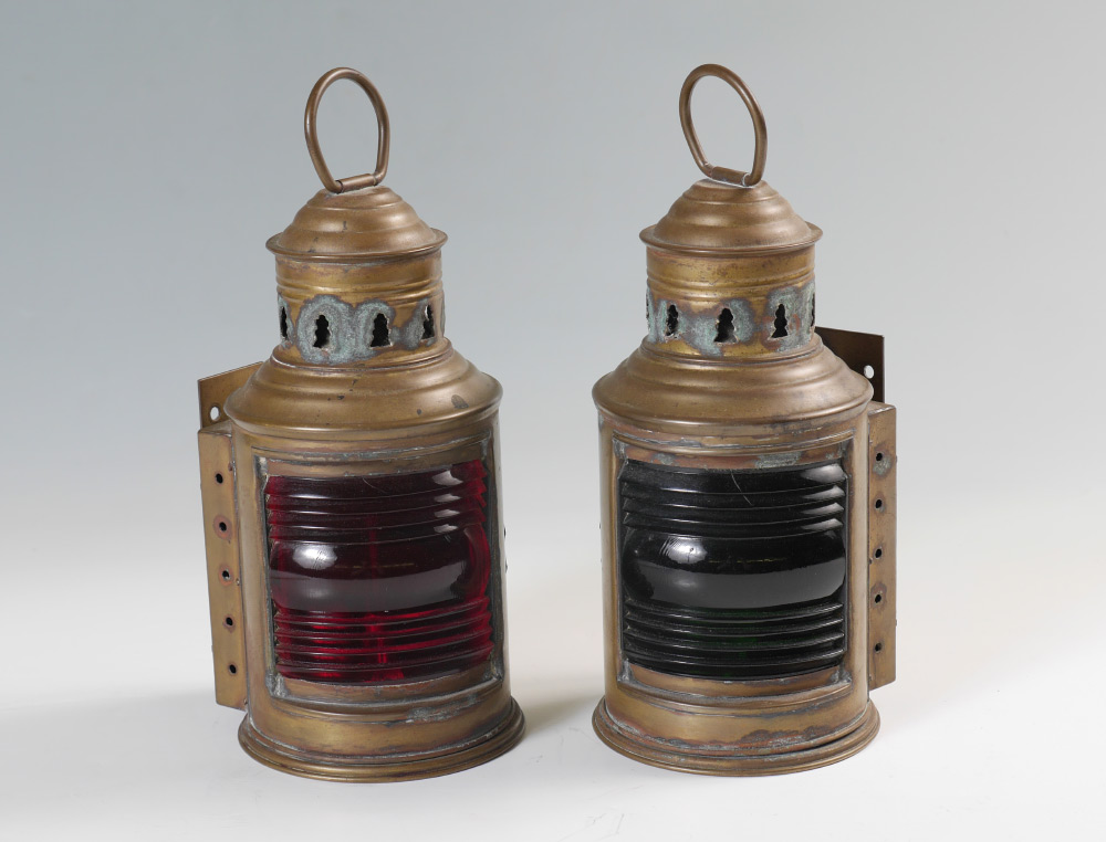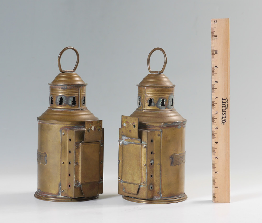 PAIR WILCOX-CRITTENDEN & CO. BRASS SHIPS LANTERNS: Diminutive brass lanterns, one with green and one with red glass, marked on side, original fuel tanks and burners inside, overall measures11 8 3/4'' h. x 5''.