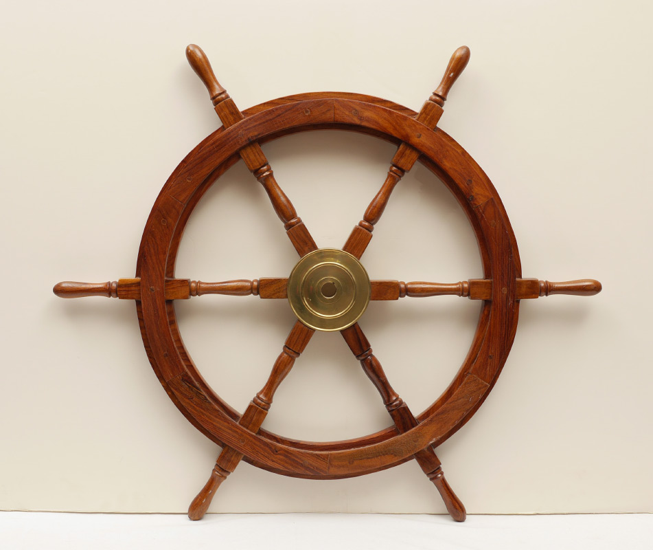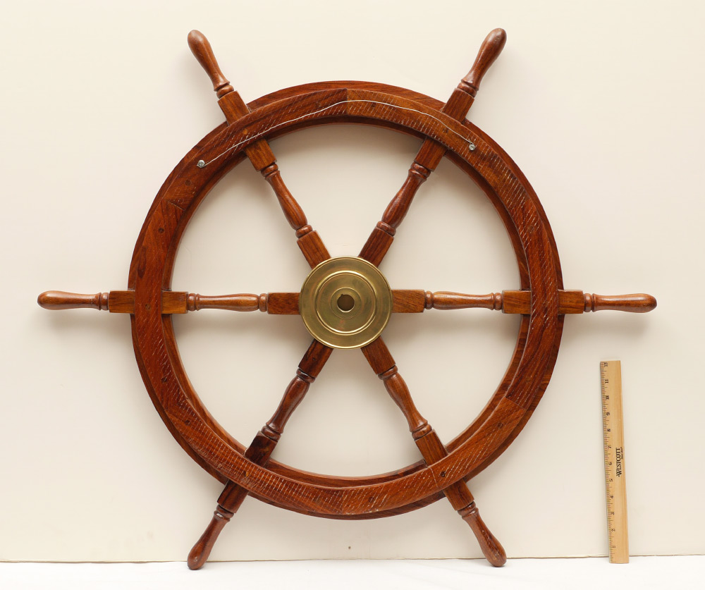 OAK & BRASS SHIP'S WHEEL: Contemporary wheel, measures 36 3/4 dia. x 2 1/4''.