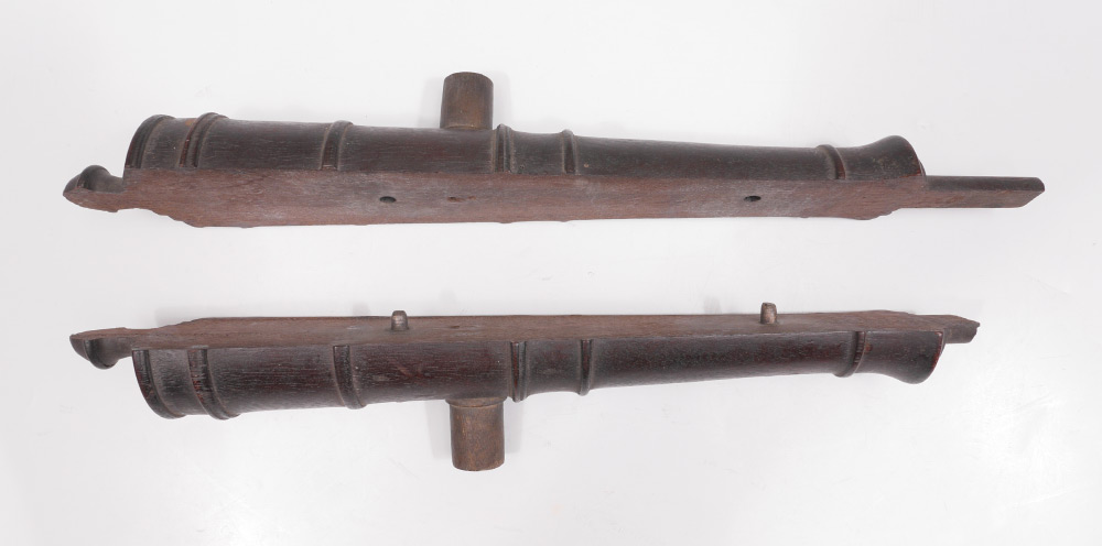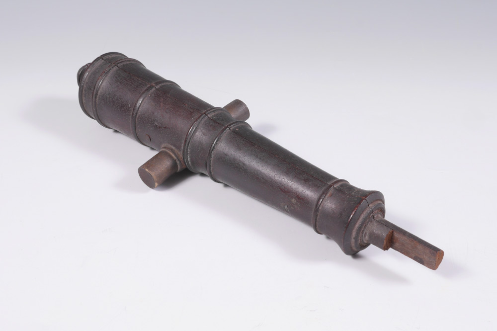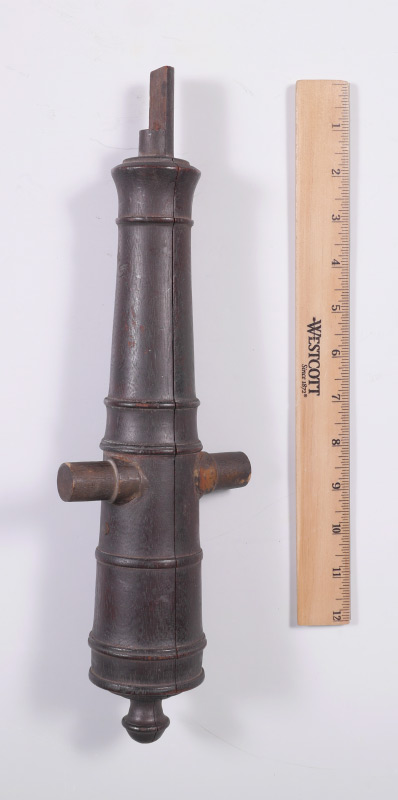 19TH CENTURY WOOD CANNON MOLD: Shaped wood mold used for the sand casting of signal cannons. Overall 14 3/4'' h. x 4 1/4''.