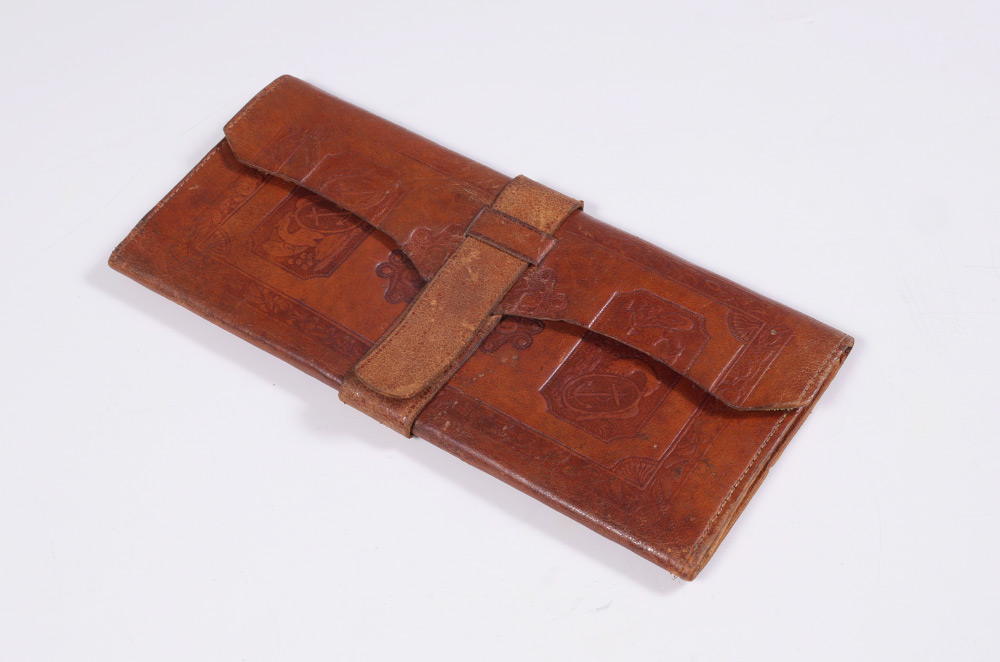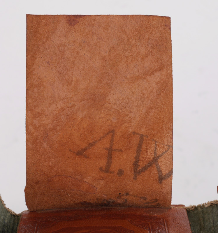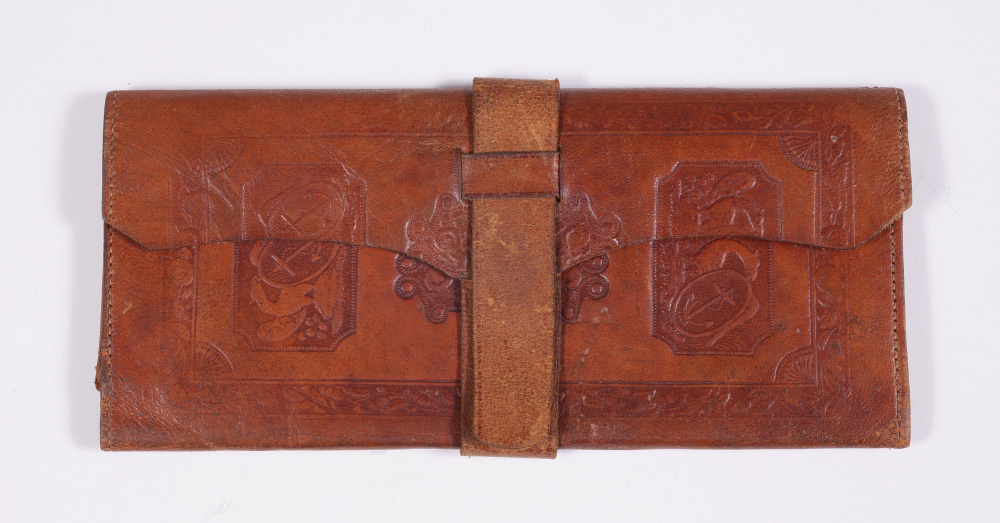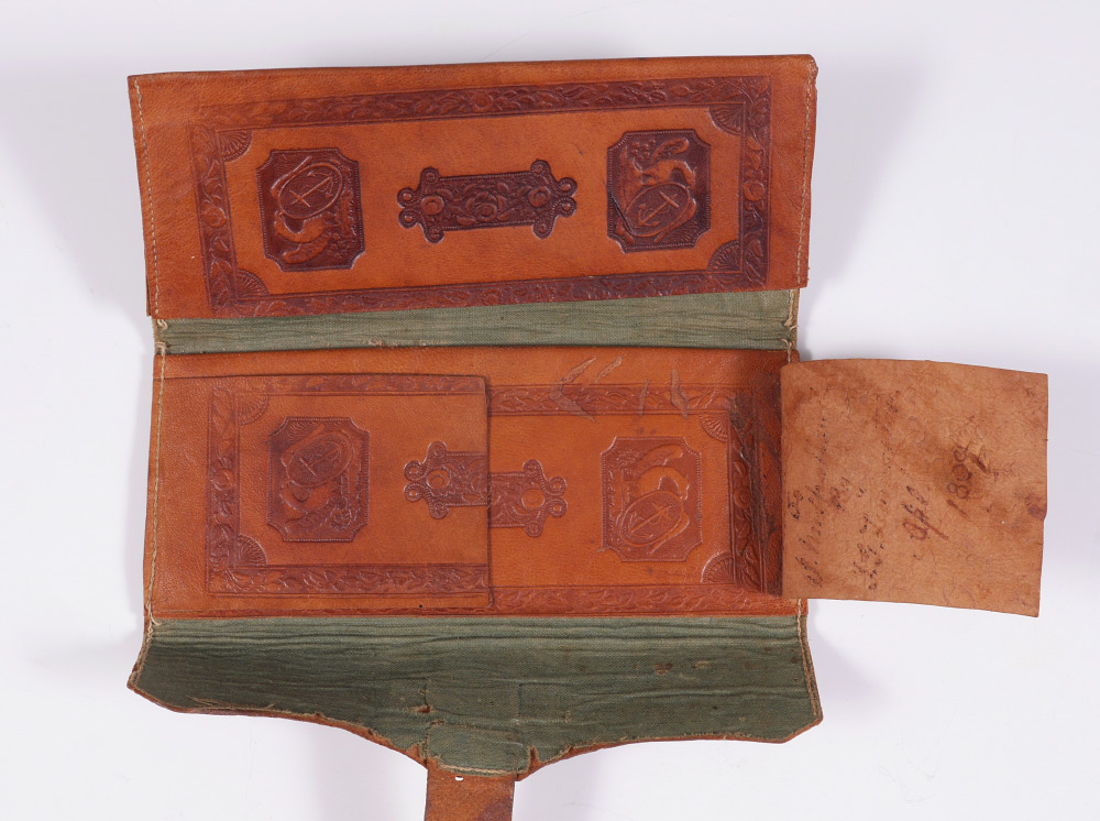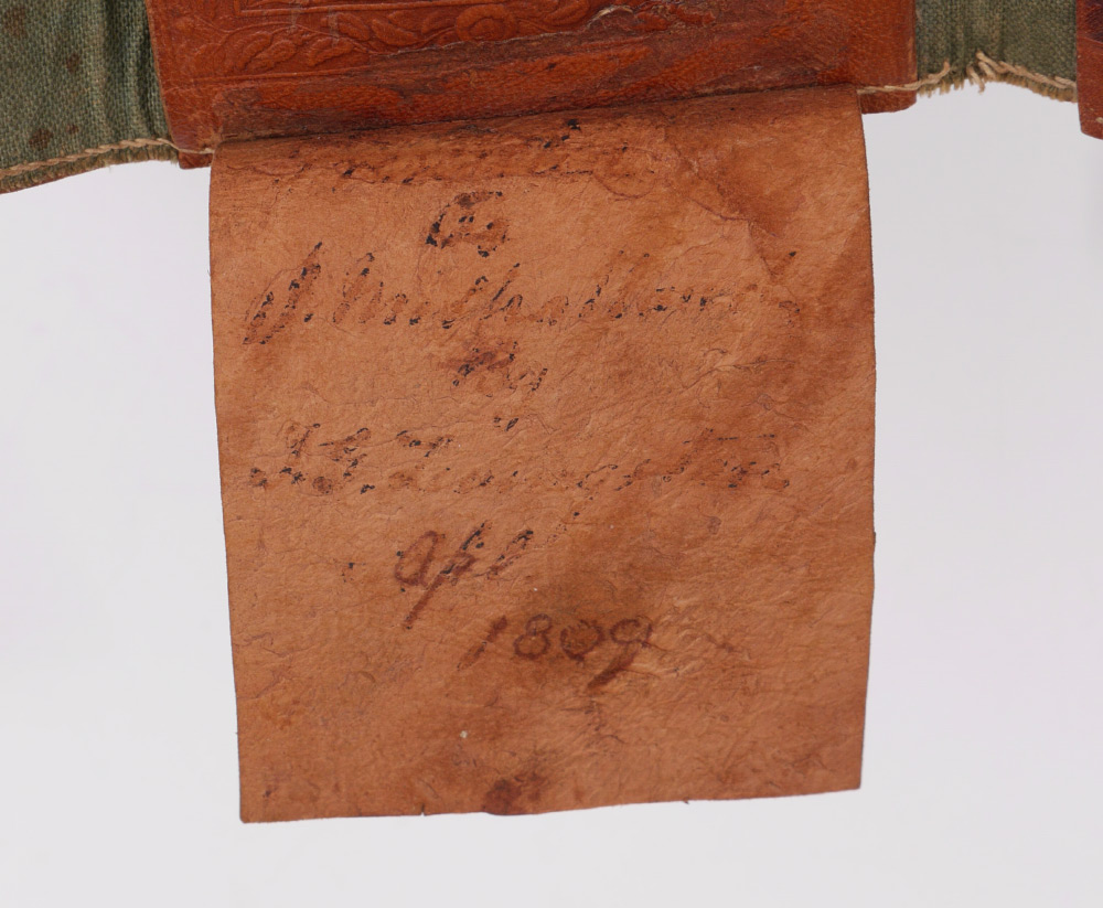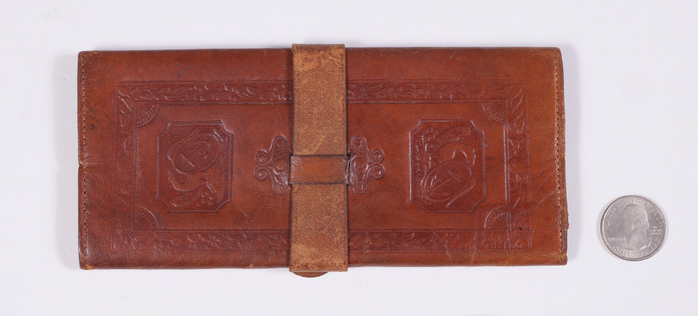 1809 US NAVAL OFFICERS LEATHER WALLET: Folding leather wallet with embossed panels of eagles, shields and anchors, foliate motifs. Partial inscription interior reads ''To, Martha Head, By, FG Livingston, APL, 1809'', initial AW on another panel. Overall 7'' x 3 1/4''.