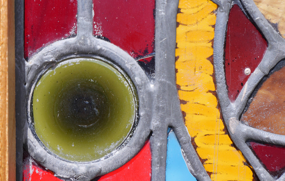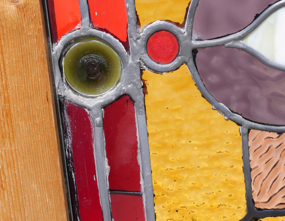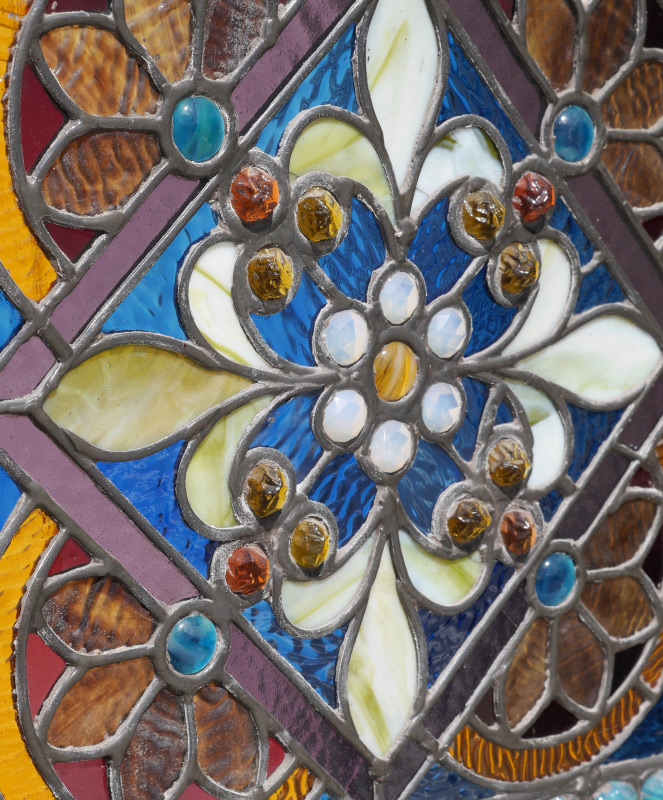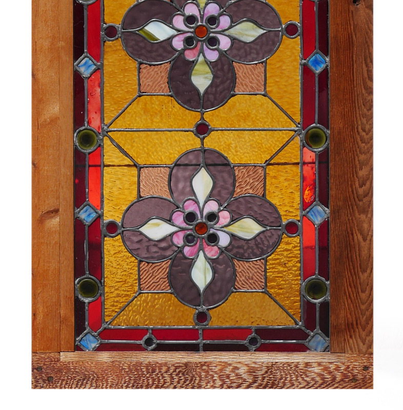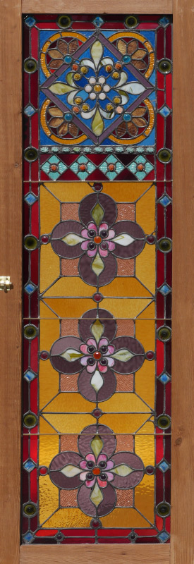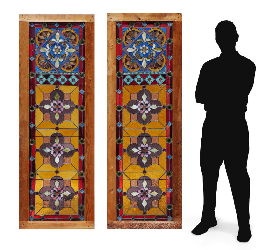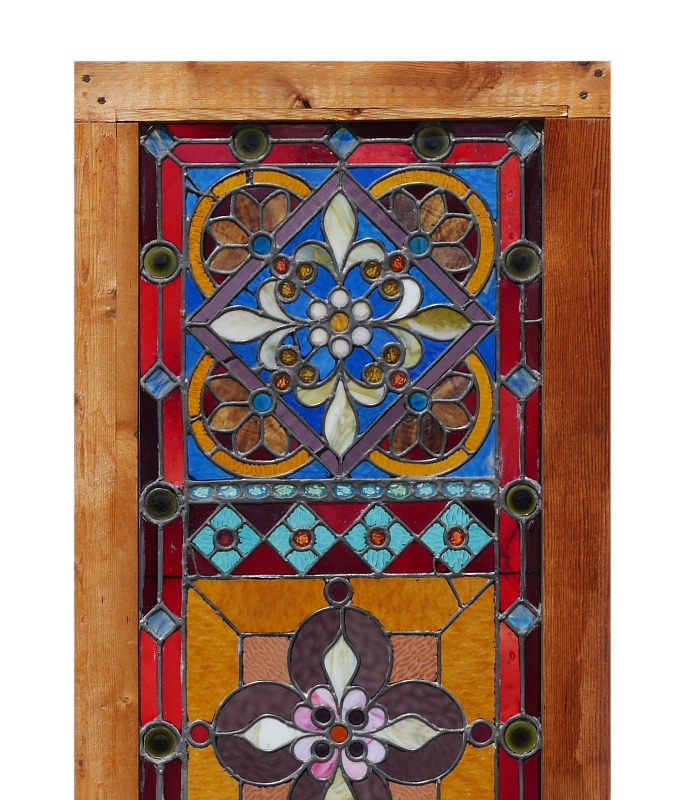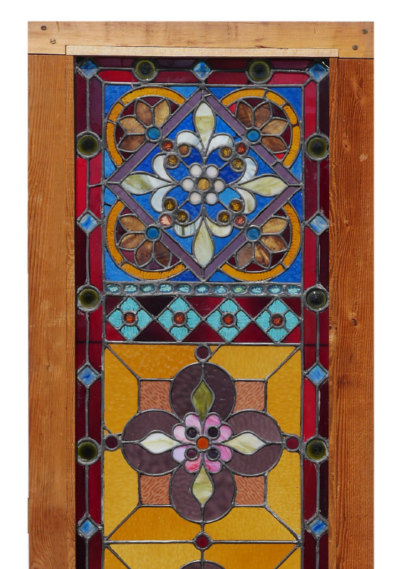 PAIR OF LEADED STAINED GLASS DOOR PANELS: Each panel with 4 stylized floral medallions, assorted jeweled, textured and polychrome glass pieces. Sight size in frame approx. 63 1/2'' x 12 3/4'', framed withe door hardware 69'' h. x 21 1/4'' x 1 3/4''.