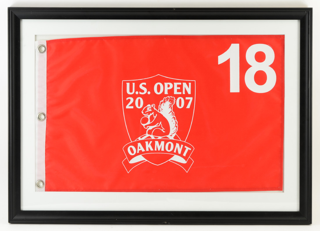 2007 US OPEN 18TH HOLE GOLF PIN FLAG: 18th hole flag from the 2007 US Open held at Oakmont, won by Angel Cabrera. Flag measures 13 3/4'' x 22'', framed under glass 19'' x 26 3/4''.