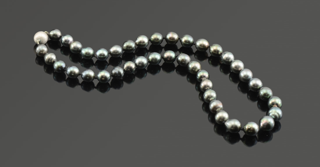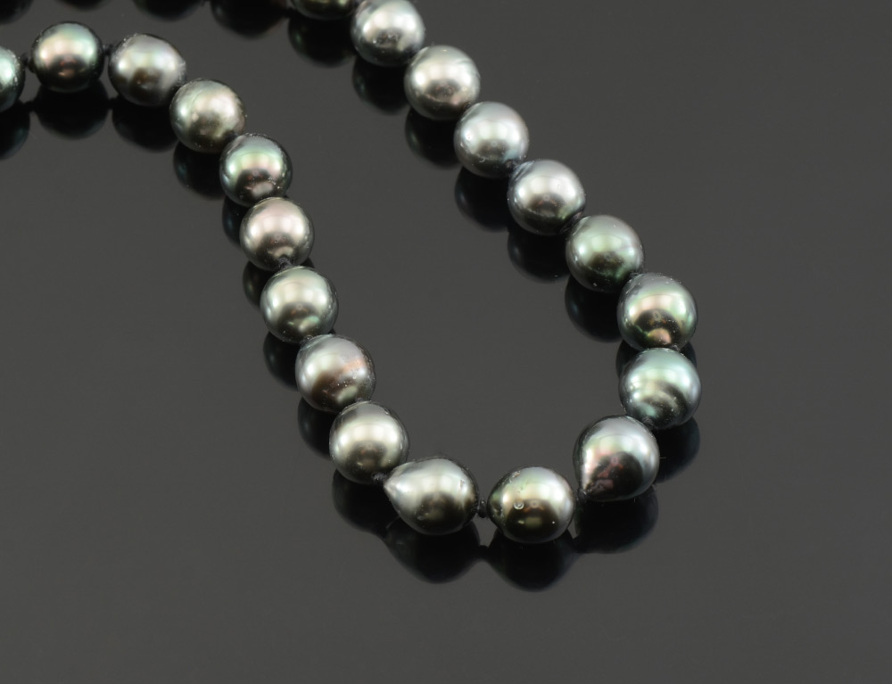 STRAND OF 9MM SEMI-BAROQUE BLACK PEARLS: 18'' strand of 9.00 mm cultured black pearls, semi-baroque in shape, blemished with high luster. 18K white gold ball clasp.