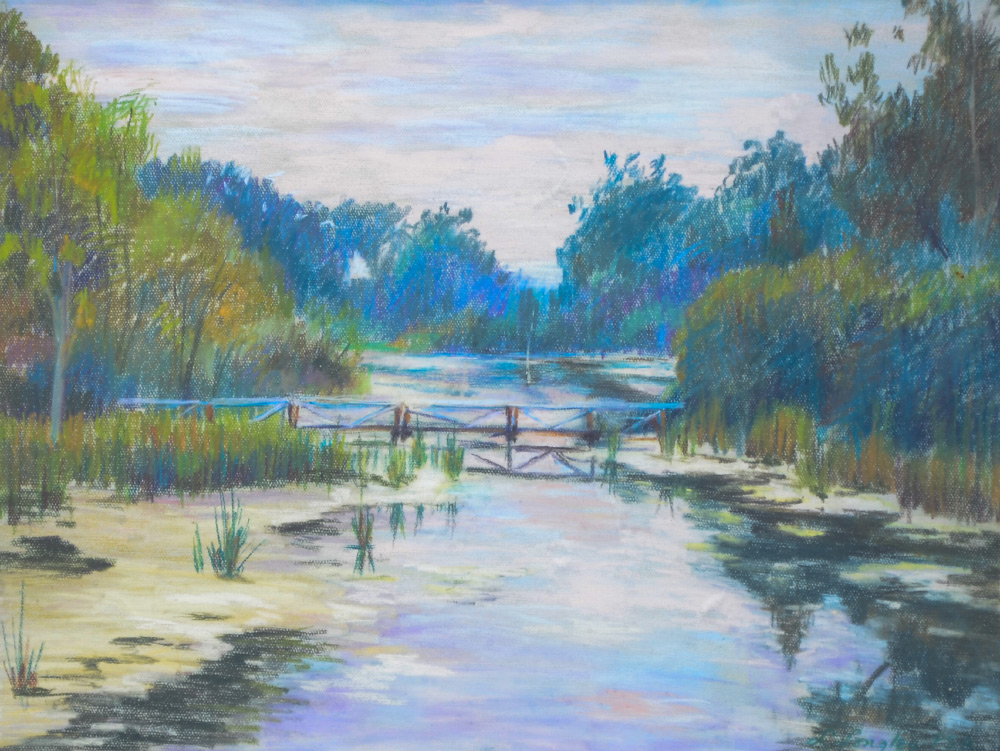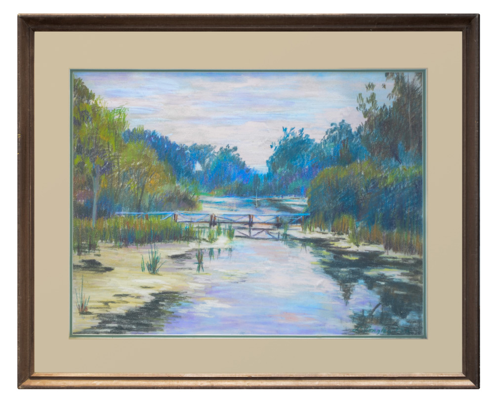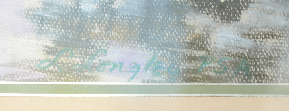 L. LONGLEY PASTEL SOCIETY PONDSCAPE: Serene Pond Scene with Bridge, signed lower right and marked PSA for Pastel Society of America, sight size 20.5'' x 27.5'', framed, 29.5'' x 36.5.