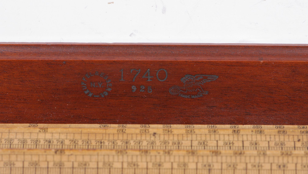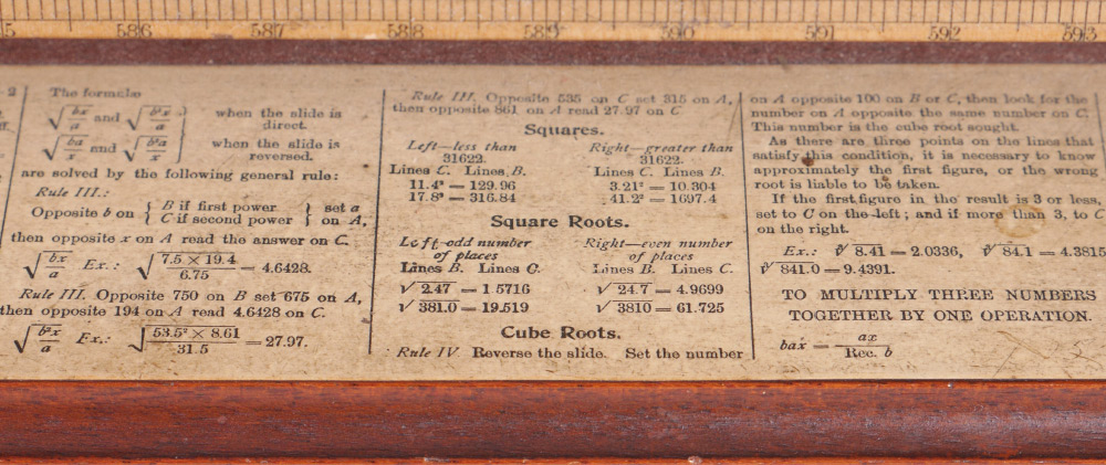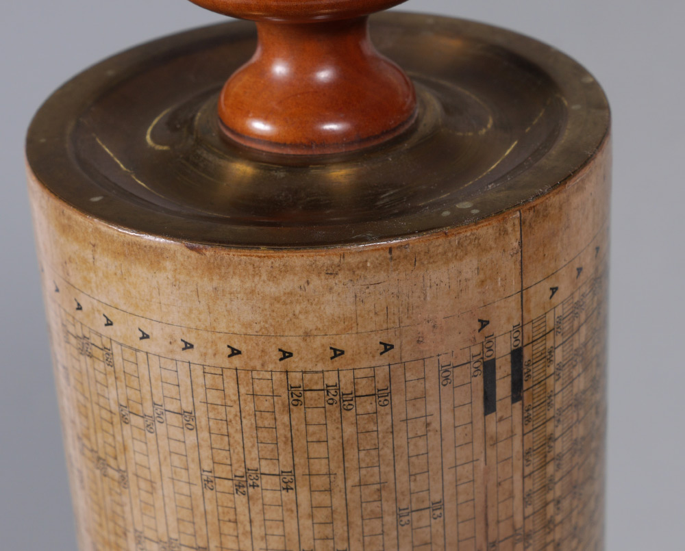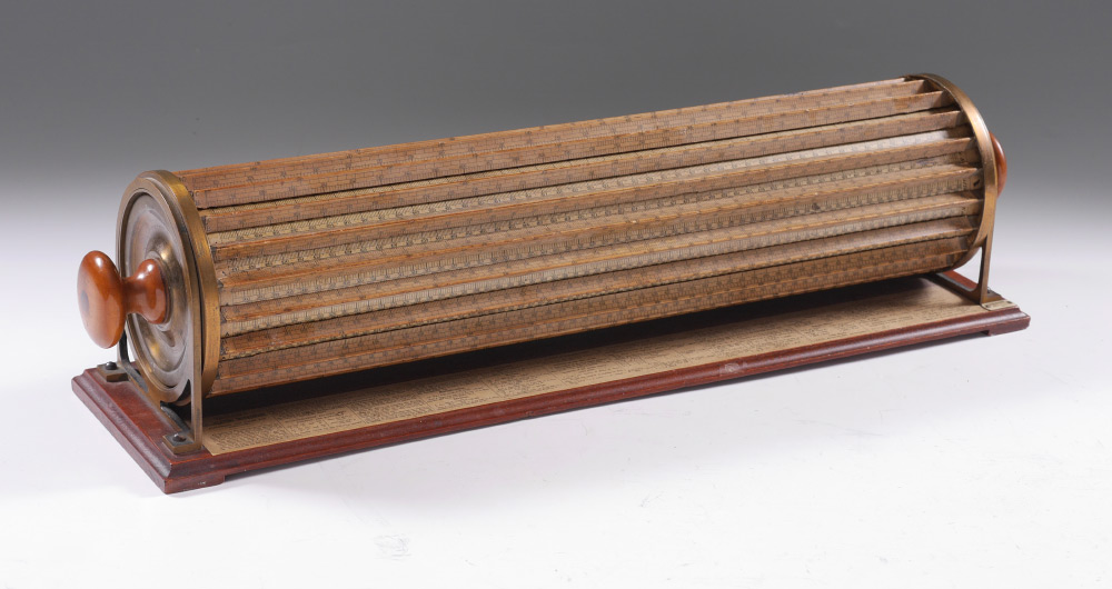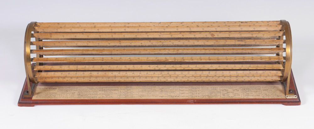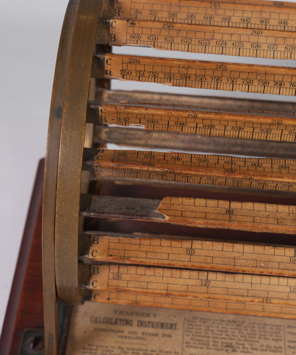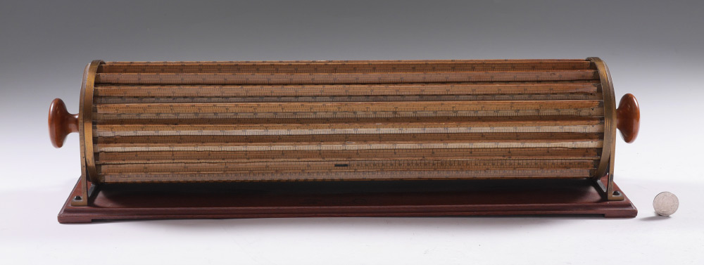 THATCHER'S CALCULATING INSTRUMENT: Retailed by Keuffle & Esser, cylindrical slide rule patented by Edwin Thatcher, mahogany base and handles, original instructions on base. Overall measures 6'' h. x 22''
