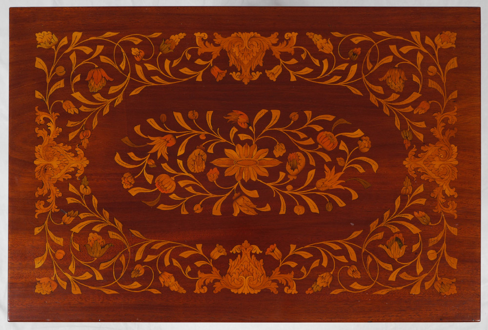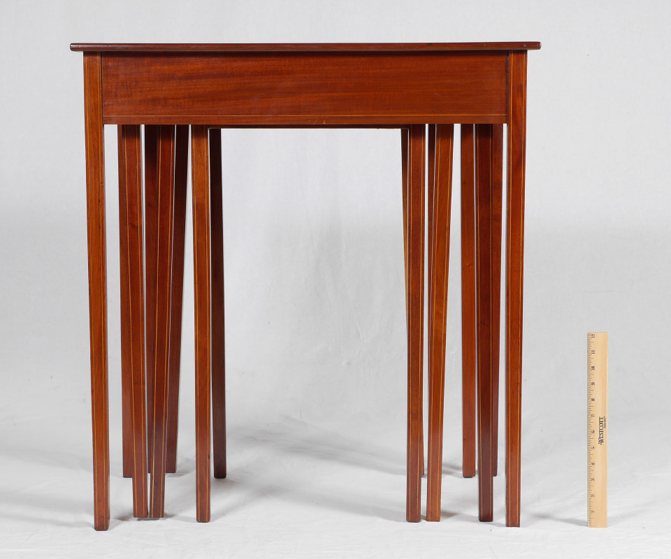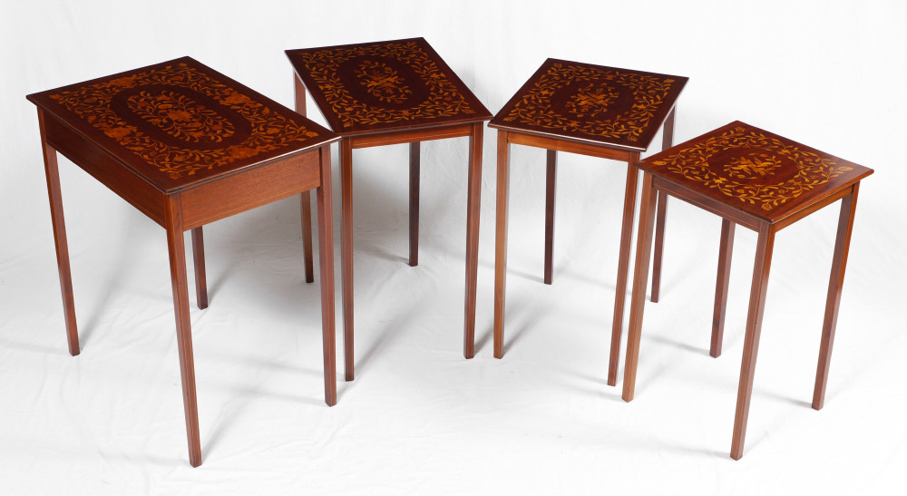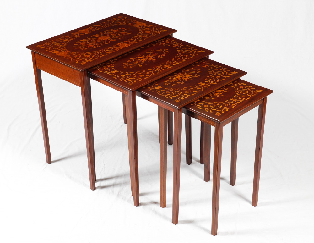 4 PIECE DUTCH INLAID NEST OF TABLES: 4 nesting tables, each with floral marquetry and string inlay, tallest measures 30'' h. x 28'' x 18 1/4''.