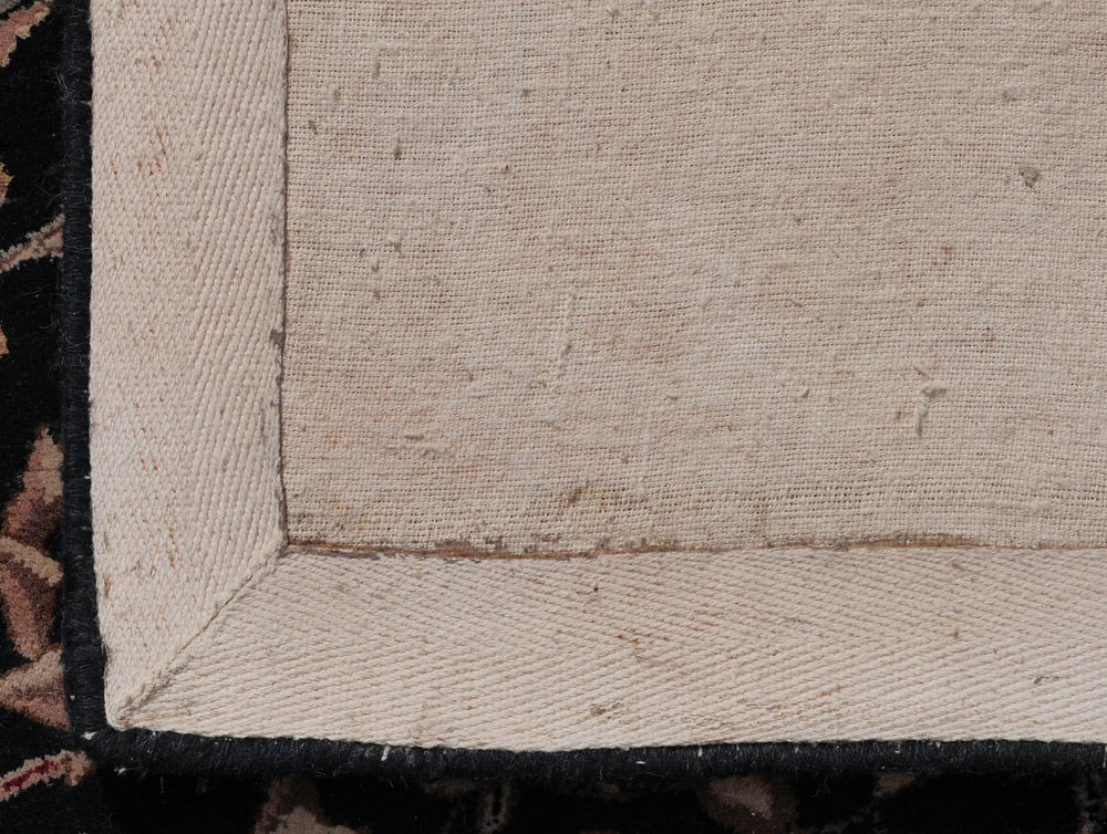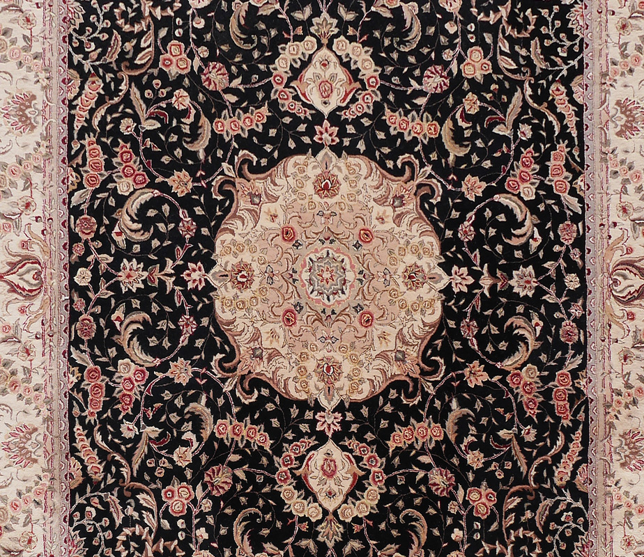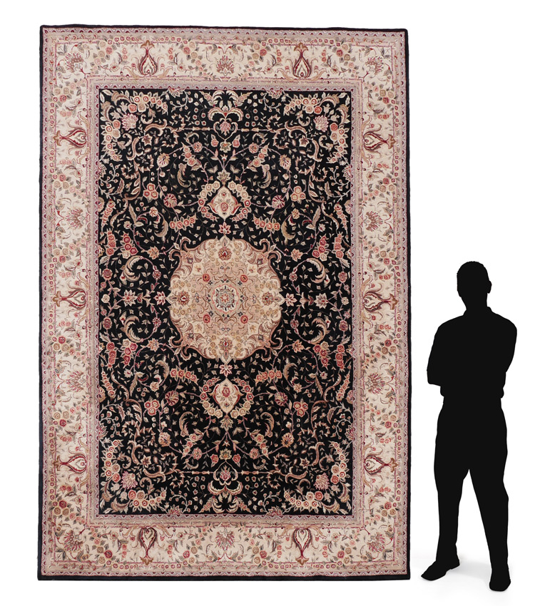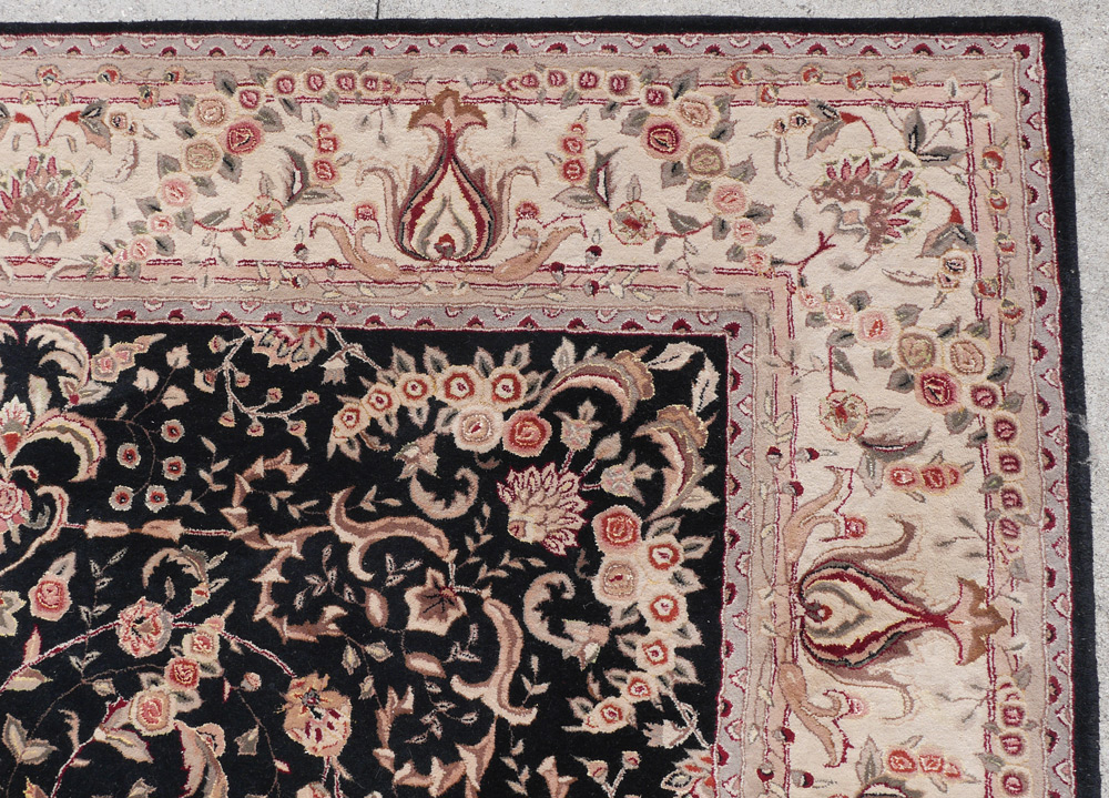 APPROX 20-40 YR OLD SINO-PERSIAN HAND TUFTED WOOL RUG, 8' x 11': The black field of this rug is contrasted by the round ivory central medallion and its matching ivory main border. Condition is good.
