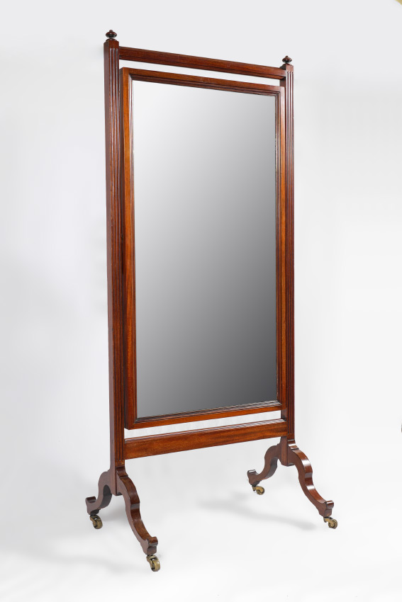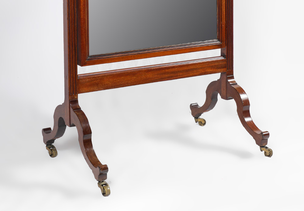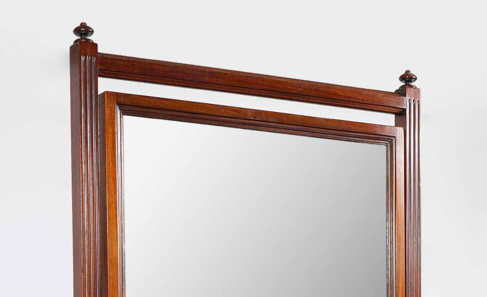 VICTORIAN MAHOGANY CHEVAL MIRROR: Mahogany support frame with turned finials, fluted decoration on one side, shaped legs, all on castors, overall measures 80 1/2'' h. x 34 1/4'' x 24''. Framed mirror measures 56'' h. x 30 1/2'' x 2''.