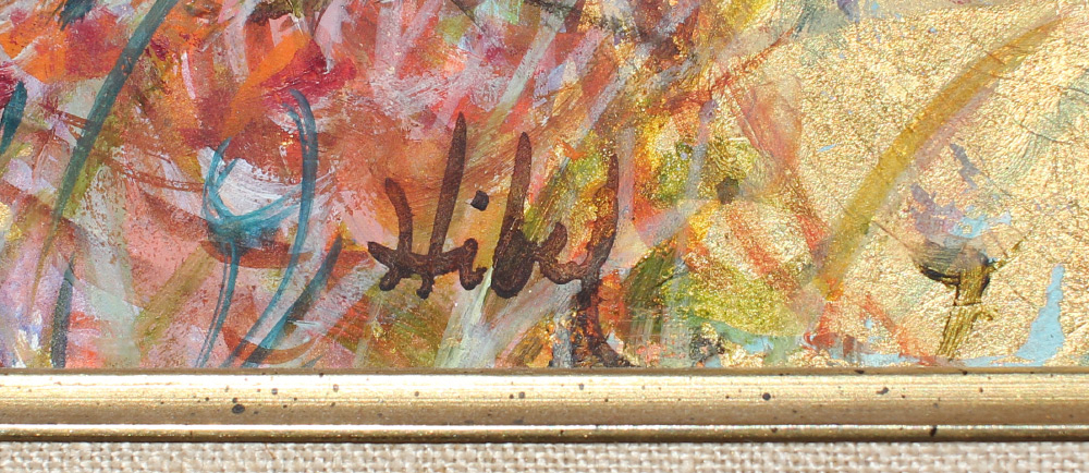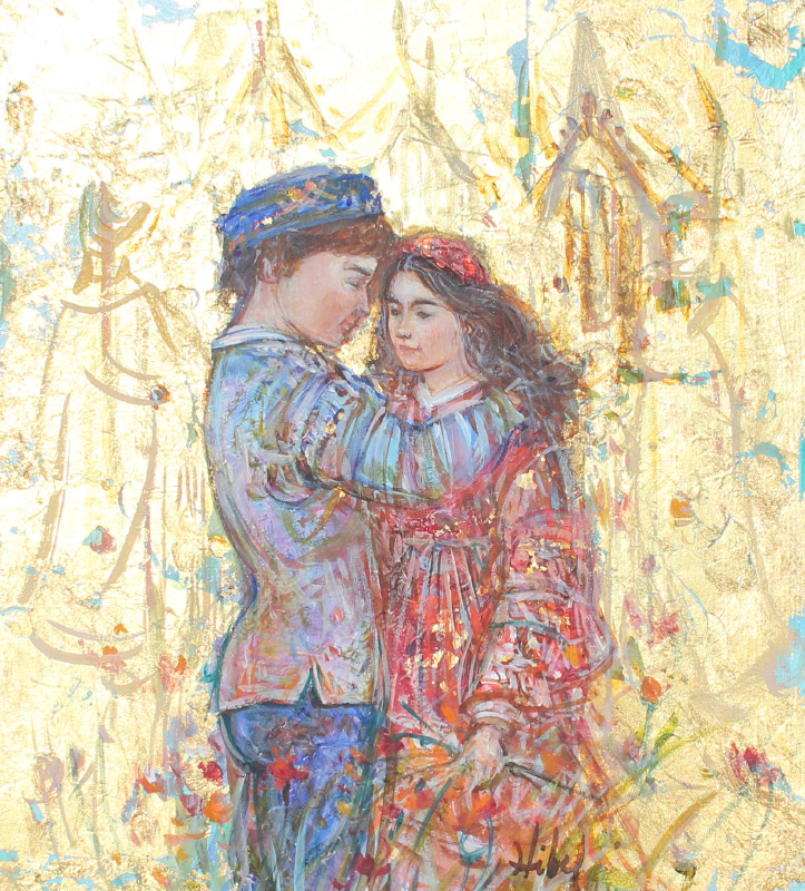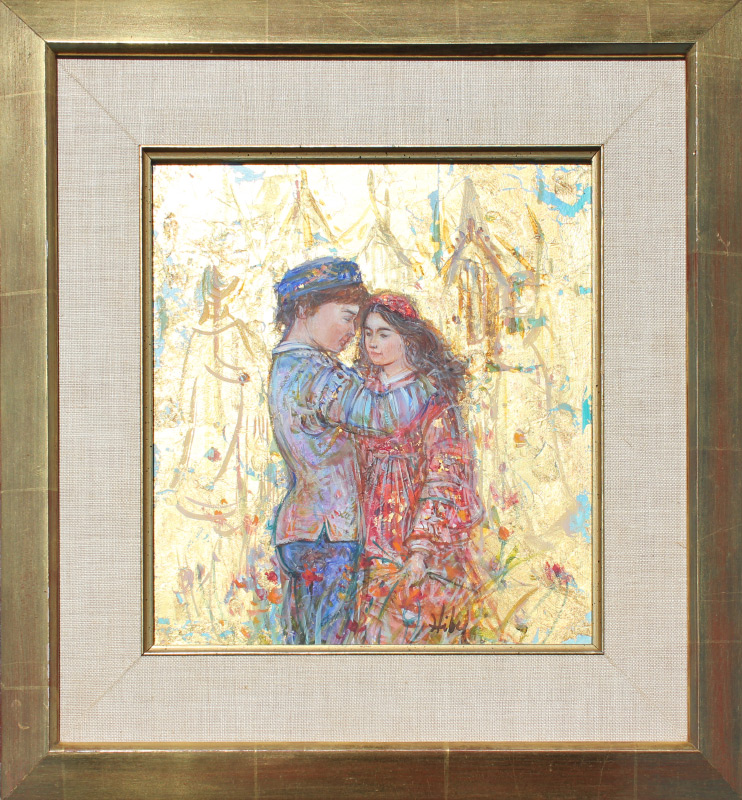 HIBEL, Edna, (American, 1917- 2014): Young Love, Oil/Gold Foil/board, 9.5'' x 9'', signed lower right, fine frame, 14.25'' x 14.5''.