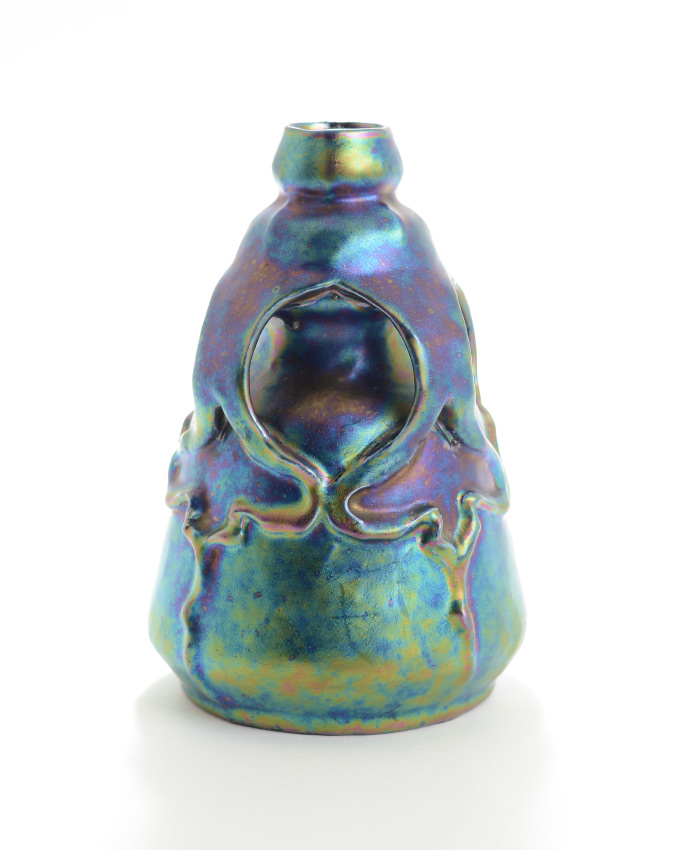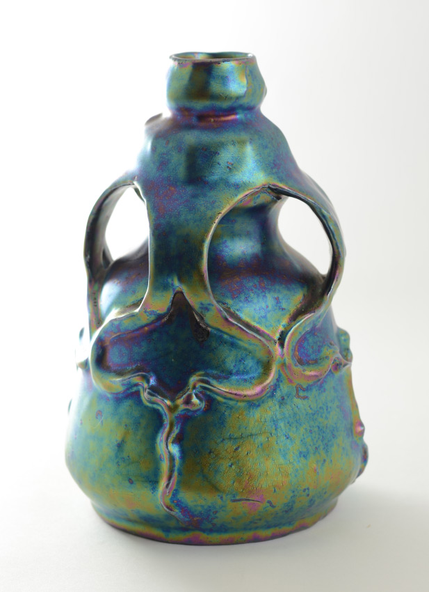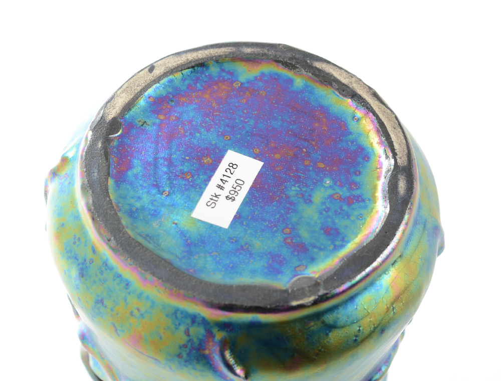 AUSTRIAN HELIOSCENE ART GLASS VASE: Bulbous iridescent glass vase with ''dripping'' handles, unmarked, overall measures 7 1/4'' h. x 5''.
