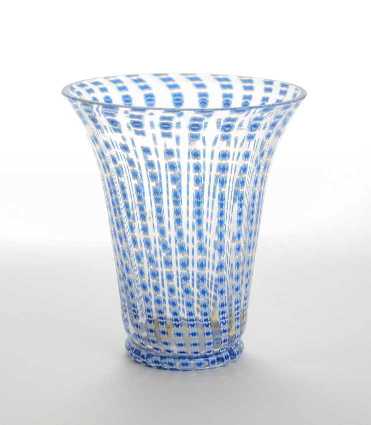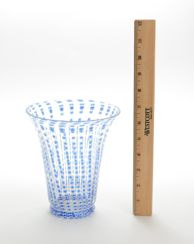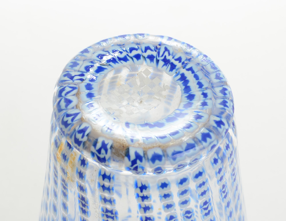 LOETZ MILLEFIORI VARIATION AUSF 142 VASE: Ribbed clear glass with lines of repeating blue and white pattern squares with a slight twist, unmarked, overall measures 8 1/2'' h. x 6''. Similar examples on display at the Passauer Museum in Germany.