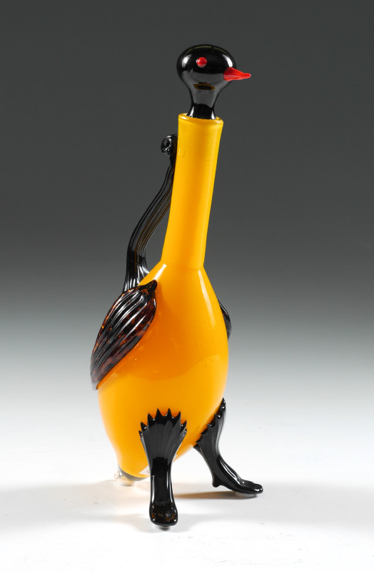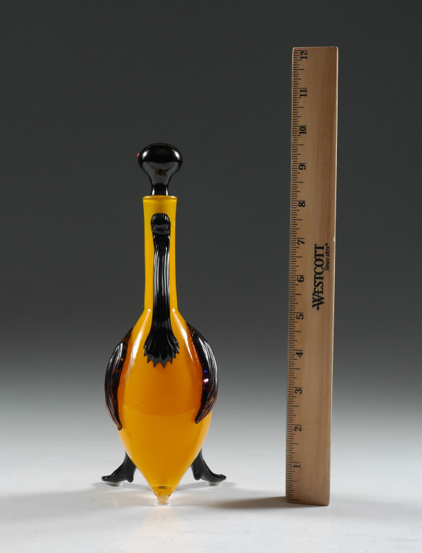 HARRACH ORANGE TANGO ART GLASS BIRD DECANTER: Pattern 7/319 from Harrach glass, orange body with black handle and feet, tortoise shell appearance wings, black and red head stopper. Unmarked, overall measures 9 1/2'' h. x 3 1/2'' x 3 1/2''.