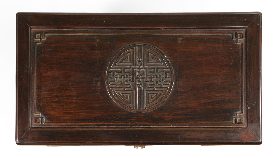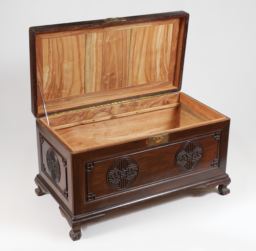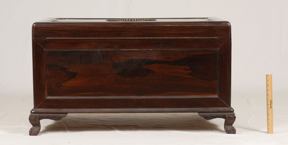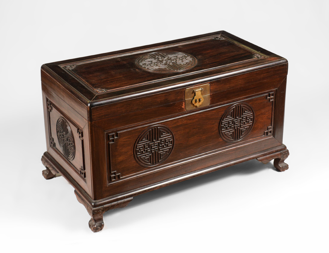 CHINESE CARVED ROSEWOOD BLANKET CHEST: Hinged lid, front and sides with carved geometric decorations, camphor wood interior, brass lock plate, on 4 paw feet. Overall measures 23 1/4'' h. x 41 1/2'' x 23''.