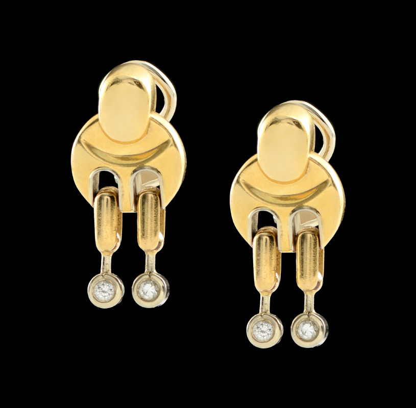 BARAKA 18K GOLD & DIAMOND DROP EARRINGS: High end Italian designer Baraka,18k yellow gold articulated earrings are accented with 2 white gold drops on each earring, each with a bezel set diamond. Post and omega closure. Total weight 11.9 grams.