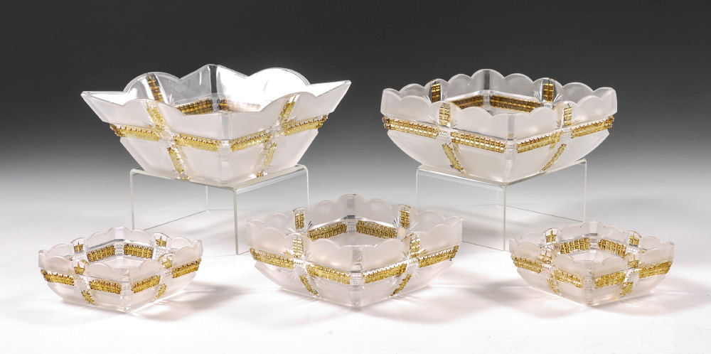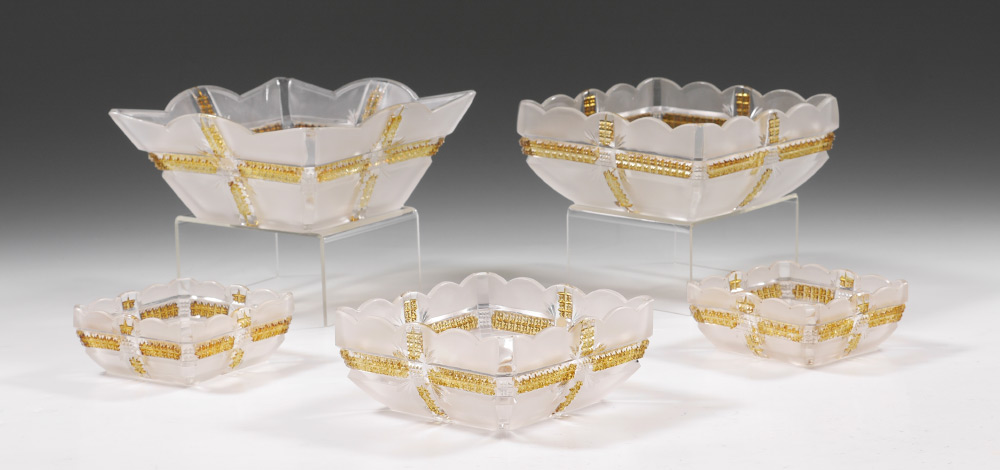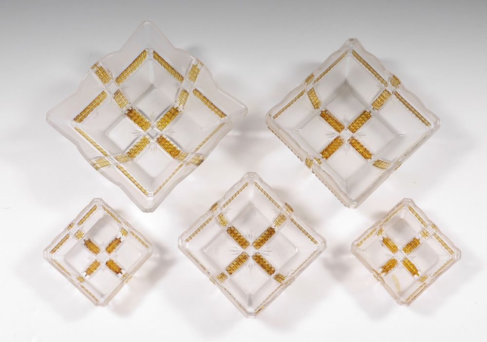5 KLONDIKE AMBERETTE OPEN SERVING BOWLS: 3 cut glass sizes in the Klondike pattern by Dalzell, Gilmore & Leighton Co., circa 1898. To include 2 larger bowls 3'' h. x 6 1/4'' square, single medium size 2 1/4'' h. x 5 1/4'' square, 2 small 1 1/2'' h x 4''. Frosted with cut amber decoration.
