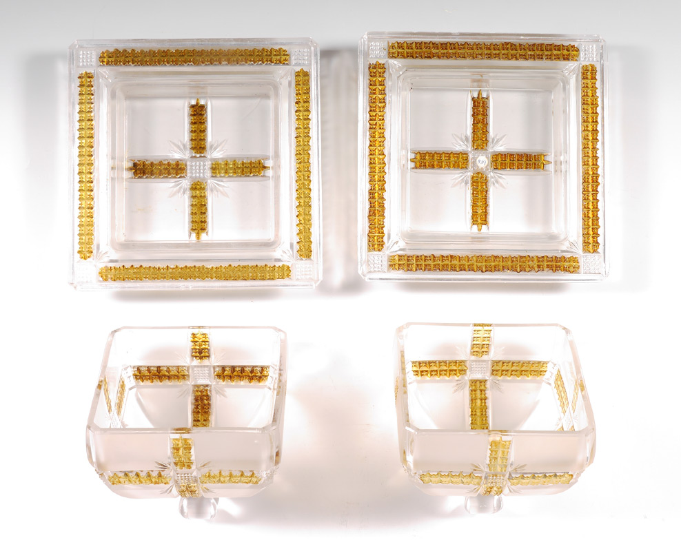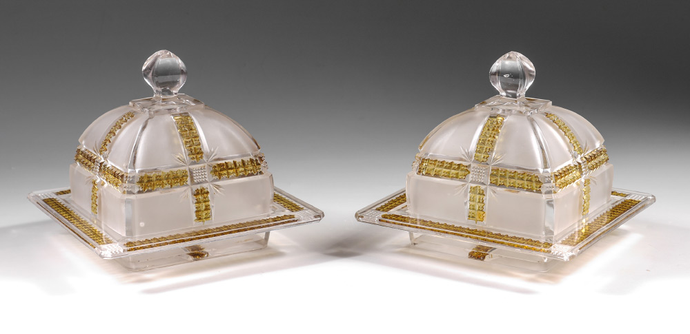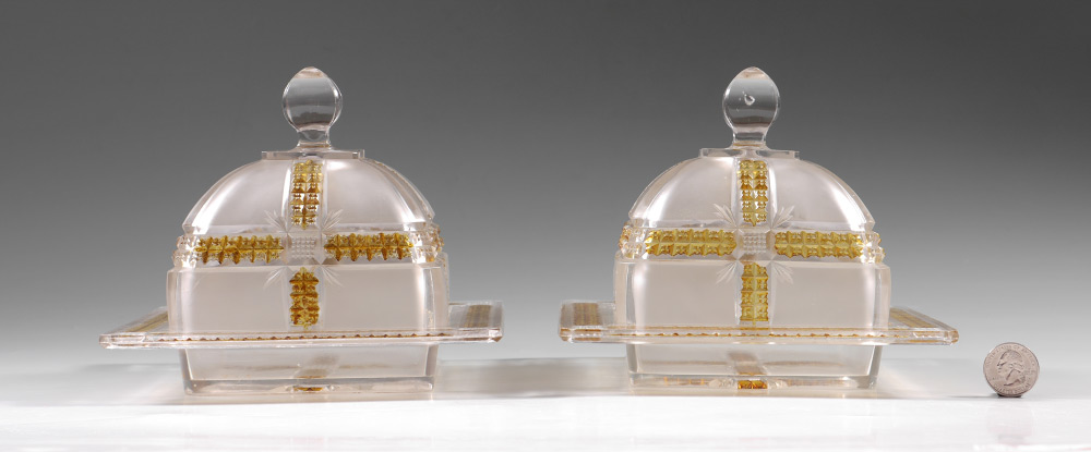 2 KLONDIKE AMBERETTE COVERED BUTTER DISHES: 2 cut glass covered butter dishes in the Klondike pattern by Dalzell, Gilmore & Leighton Co., circa 1898. Frosted with cut amber decoration. Each overall measures 6'' h. x 7'' x 7''.