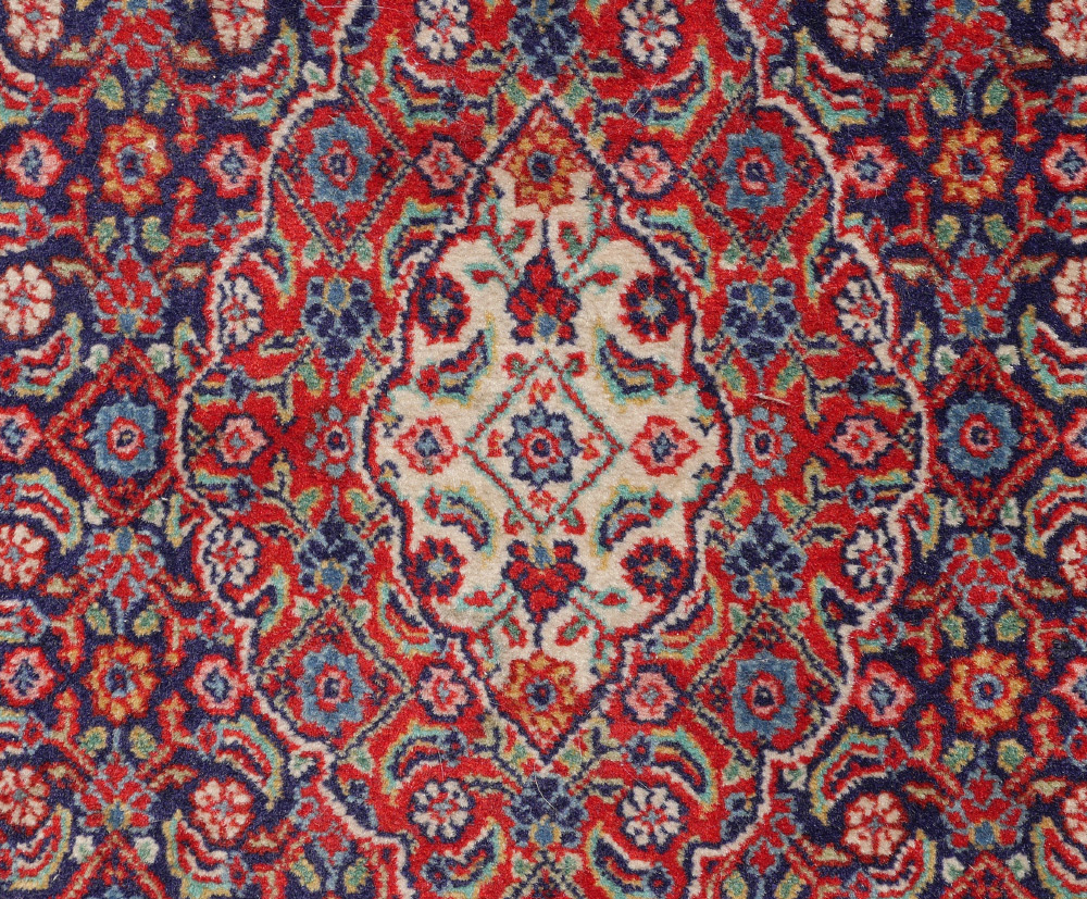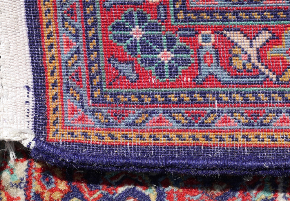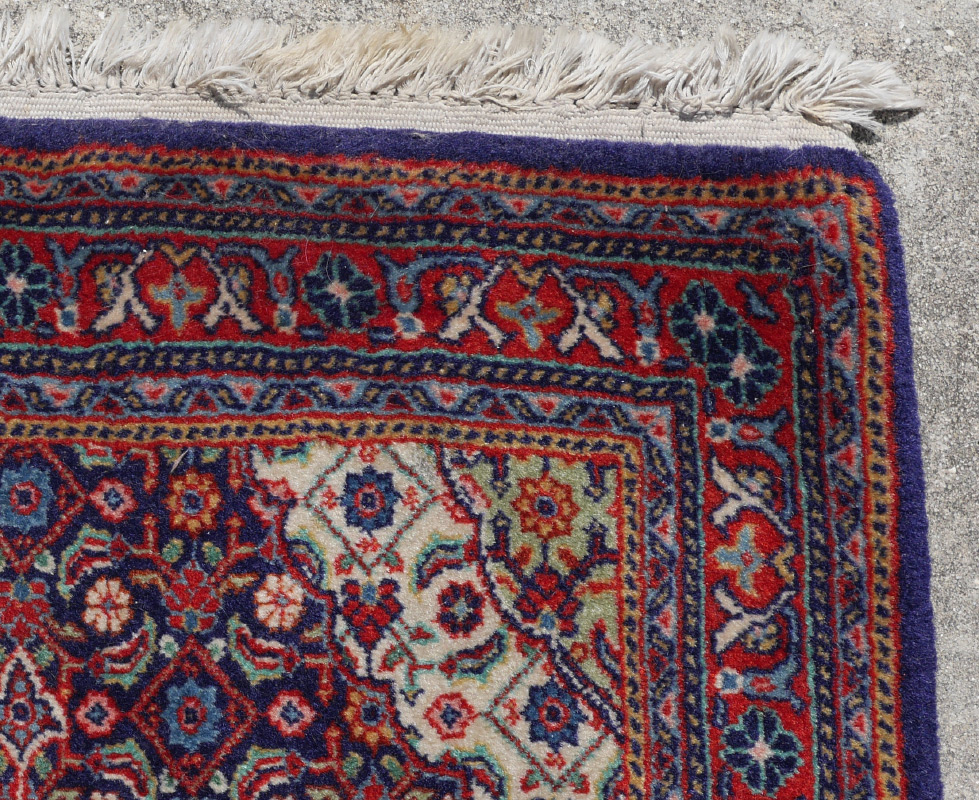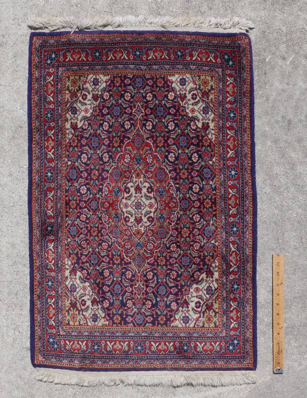 APPROX. 20-40 YR OLD TURKISH HEREKE HAND KNOTTED WOOL RUG, 2' x 2'11'': This rug comes from one of the most important weaving centers in Turkey. The red then white central medallion rests on a blue field with white and pale green corners. The field is covered with a Herati variant pattern if curved green leaves that form a repeating pattern with the red, blue, orange, and white flowers. Condition is good.