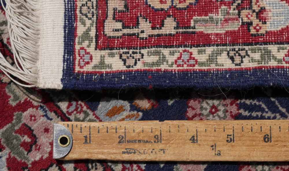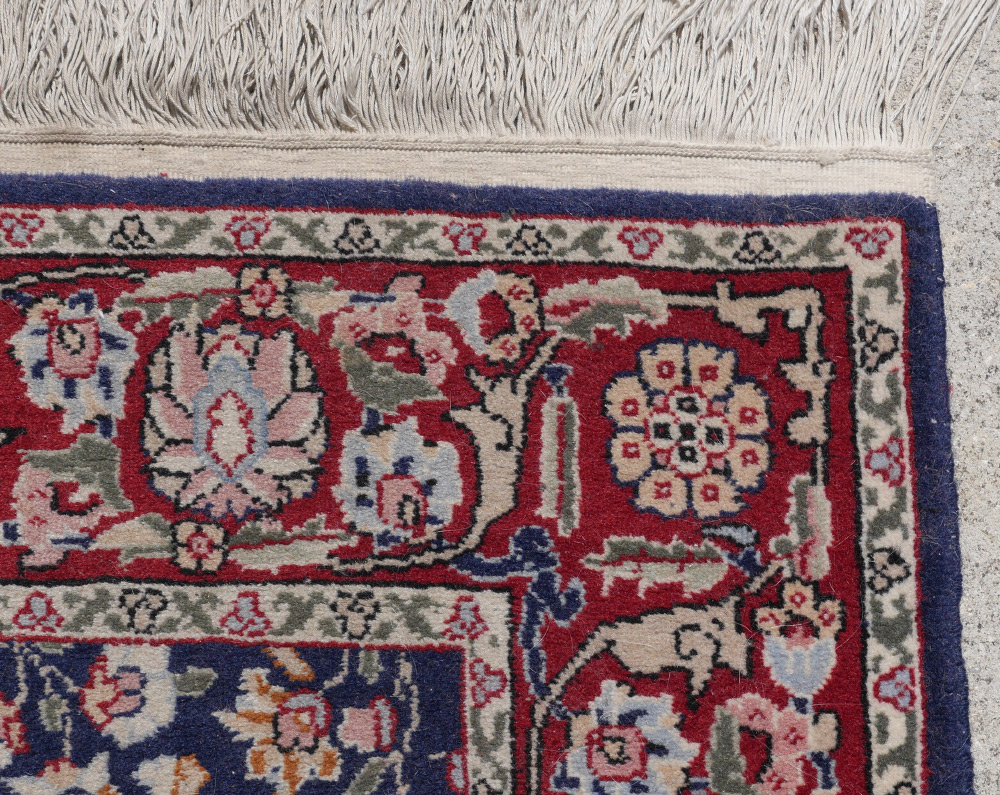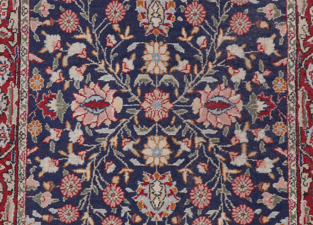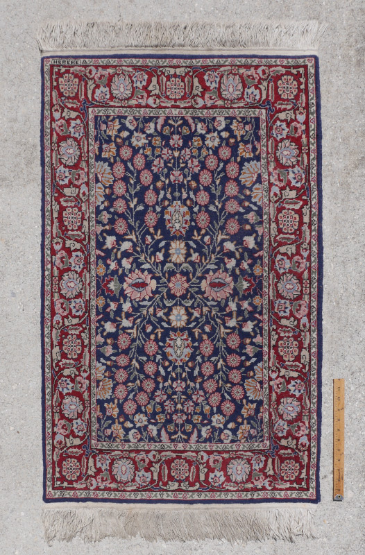 APPROX. 20-40 YR OLD TURKISH HEREKE HAND KNOTTED WOOL RUG 2'6'' x 3'8'': This is another Hereke rug from one of the most important weaving centers in Turkey. This example has a dark blue field that is covered with a variety of well-drawn flowers. The burgundy colored main border completes this rug. Condition is good.