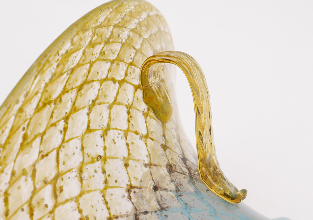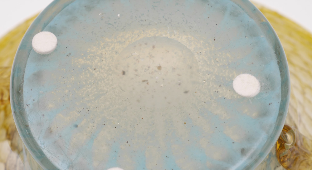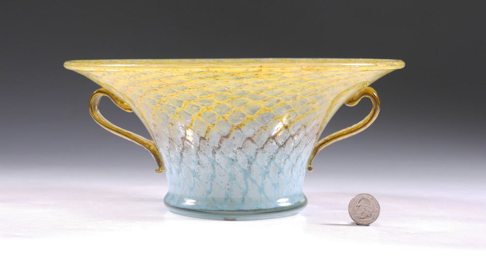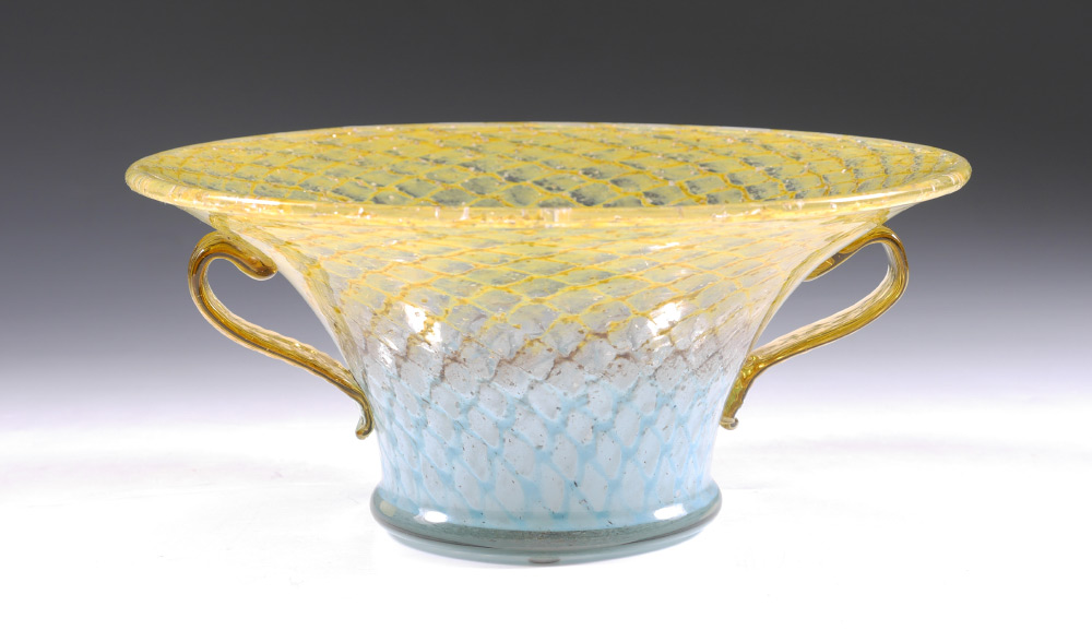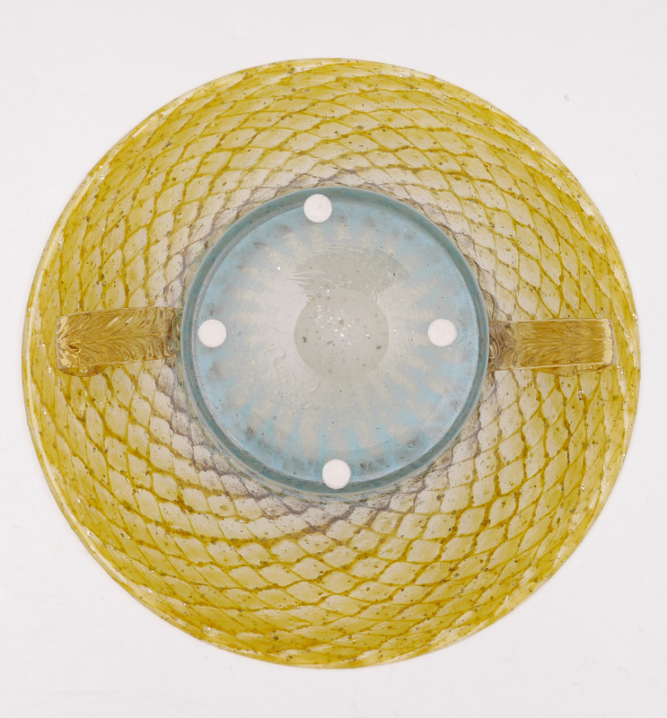 BOHEMIAN ART GLASS HANDLED BASKET: Flared rim, amber glass handles, diamond pattern graduates from yellow to blue at base, overall measures 4 3/4'' h. x 10 3/4''.