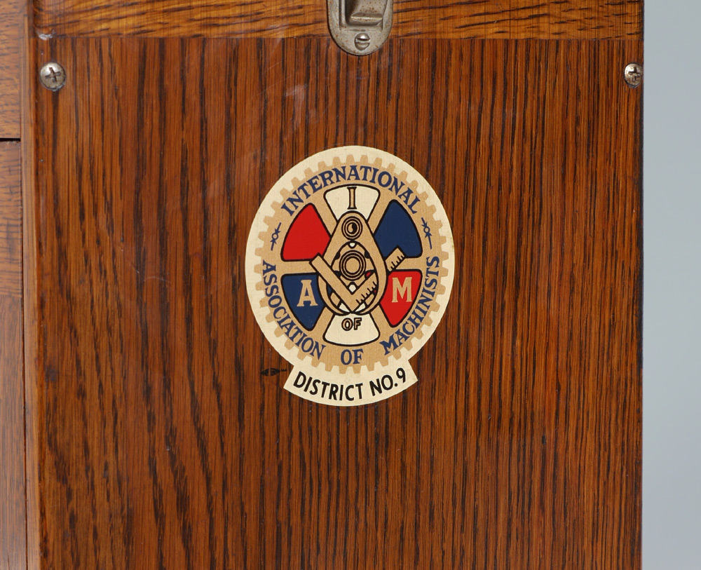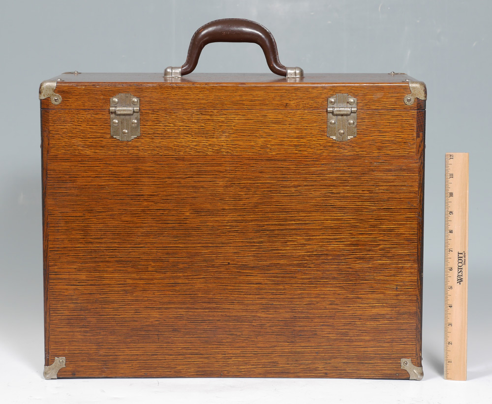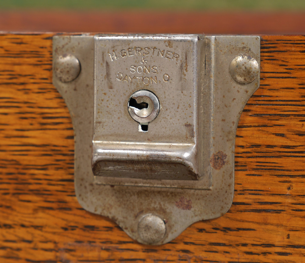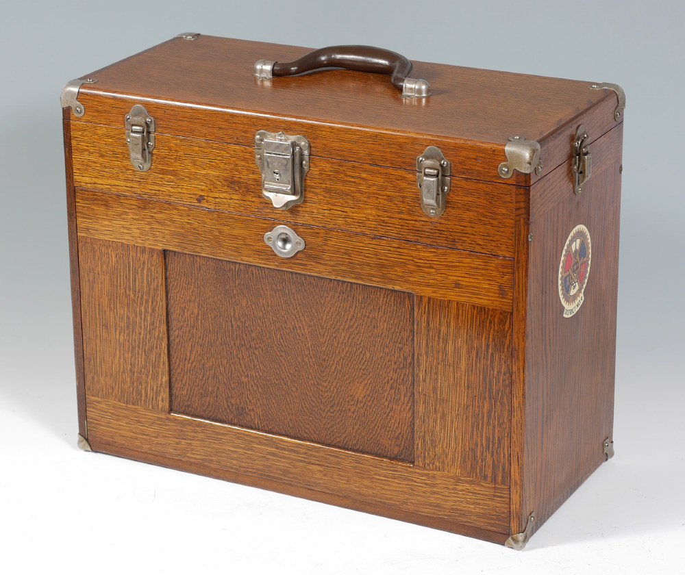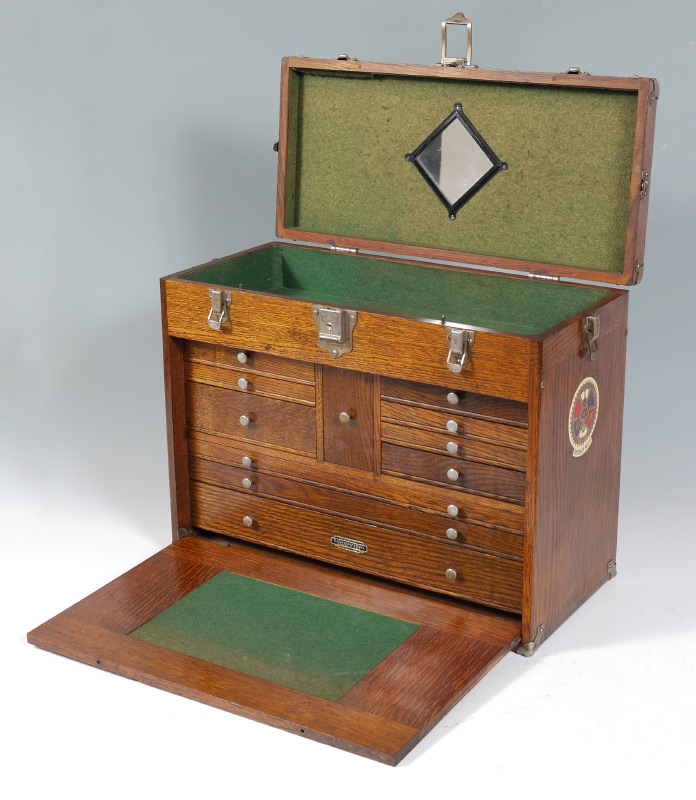 GERSTNER & SONS OAK MACHINIST CHEST: Oak case, hinged lid with felt lined interior and mirror. Fall front door with 11 drawers of assorted sizes interior. Gerstner & Sons plaque on lower drawer. 16 1/2'' h. x 20 1/2'' x 10''.