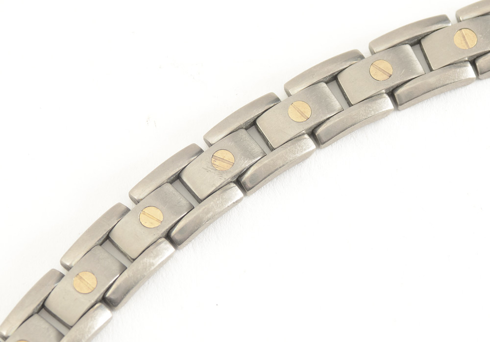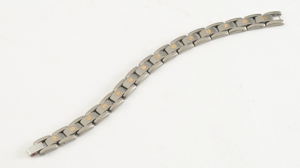 TITANIUM WITH 18K GOLD BRACELET: Titanium links with 18K gold screw elements. Length 9'', Weight 36.4 grams.