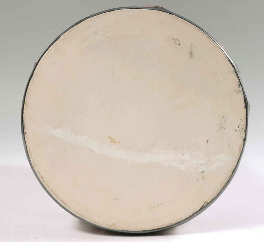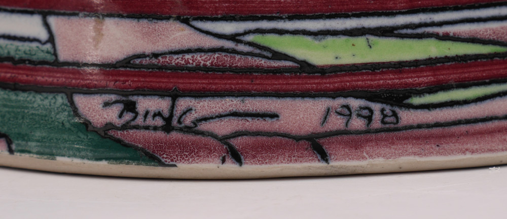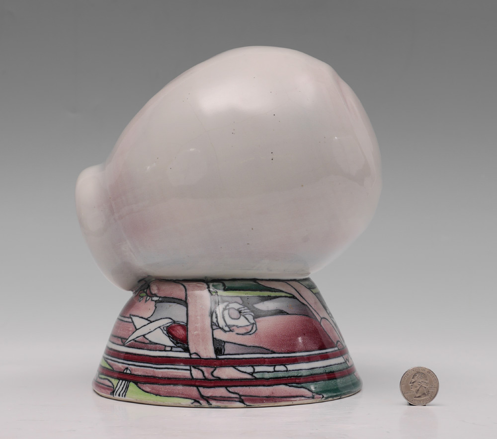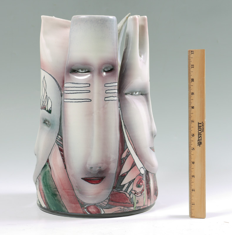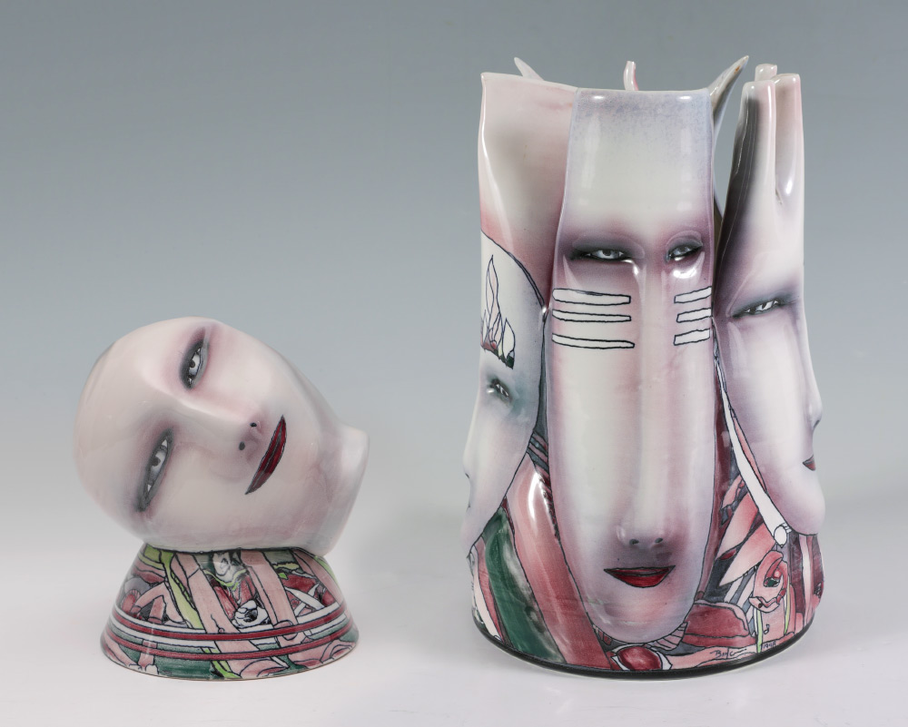 2 BING GLEITSMAN PORCELAIN FACE SCULPTURES: 2 pieces total by artist Bing Gleitsman to include 1) Tall vase with 4 figural faces, signed Bing 1998. 14 1/2'' h. x 9''. 2) Resting figural head, signed Bing 1998. 9'' h. x 8''.