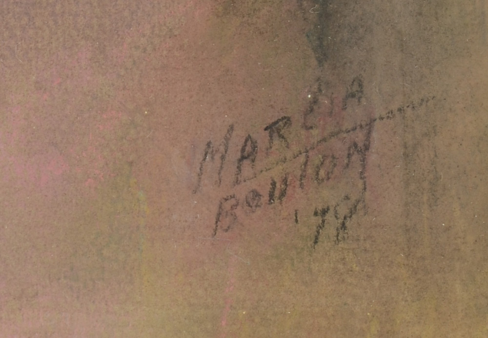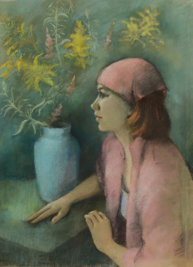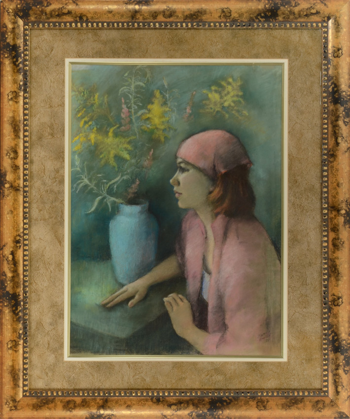 BOUTON, Marcia Bennett, (American, 1919-2014): Seated Young Redhead in Pink with Blue Vase Filled with an Arrangement of Flowers, Pastel, 25.5'' x 18'', signed and dated 78 lower right, faux burl frame, 36.5'' x 30.5''.
