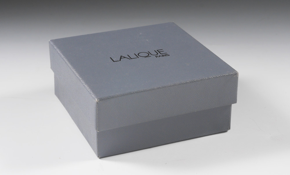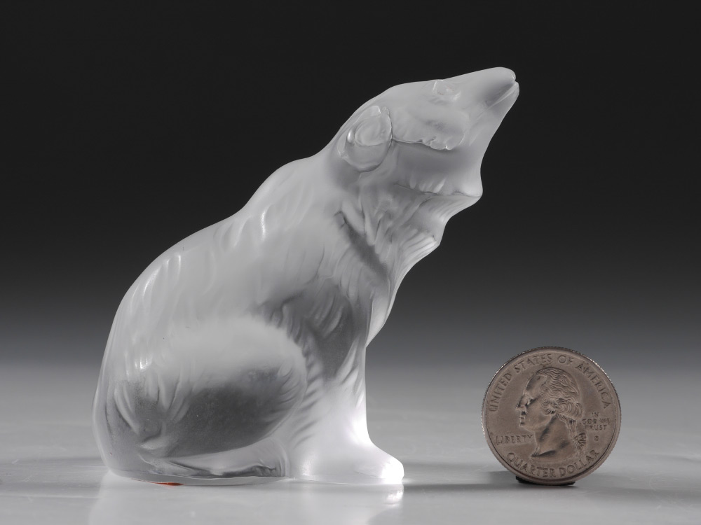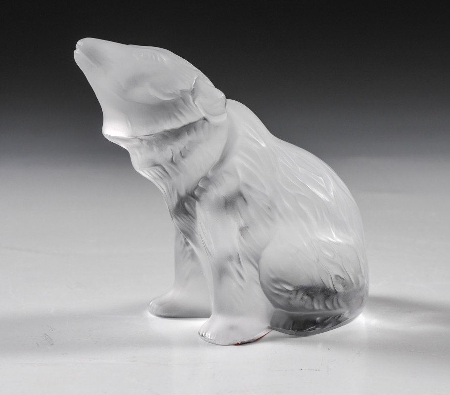 LALIQUE CRYSTAL FROSTED CRYSTAL BEAR FIGURE: Figure of a seated bear, 3'' h x 2 1/2'', sold with the original box 2 1/4'' h. x 4 1/2'' x 4 1/2''.