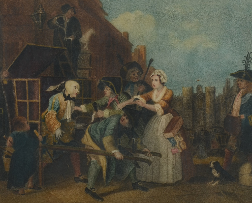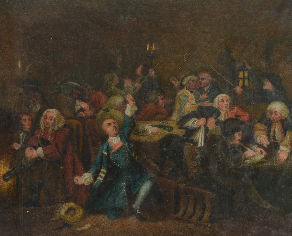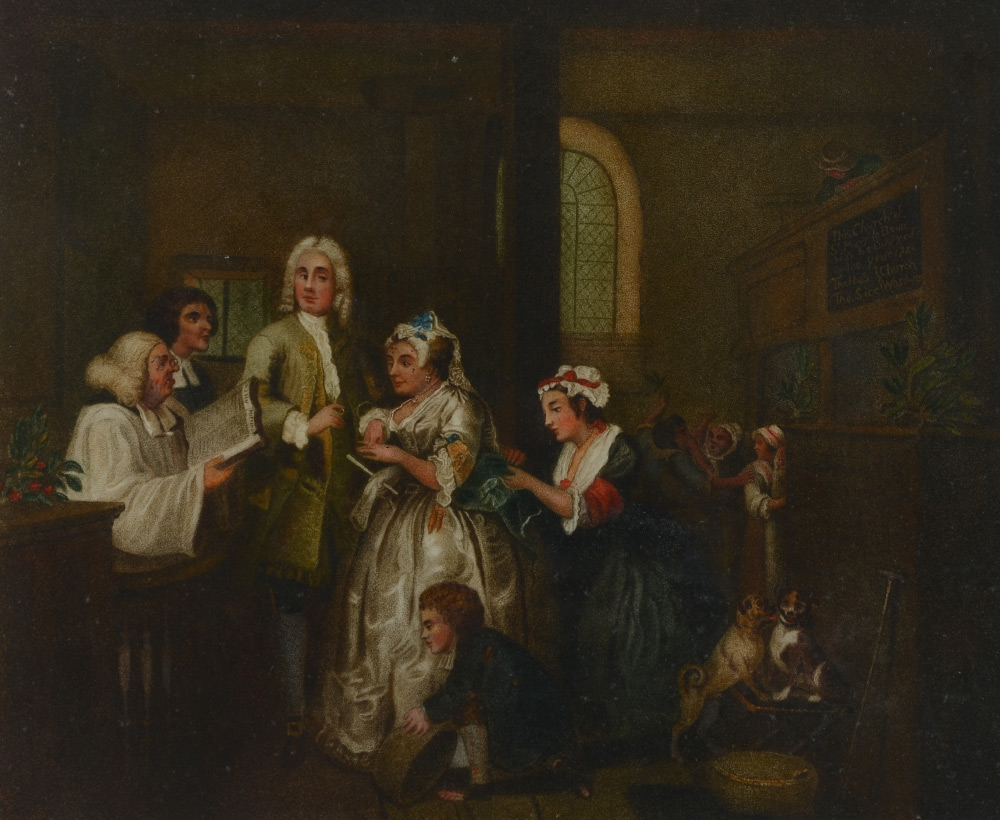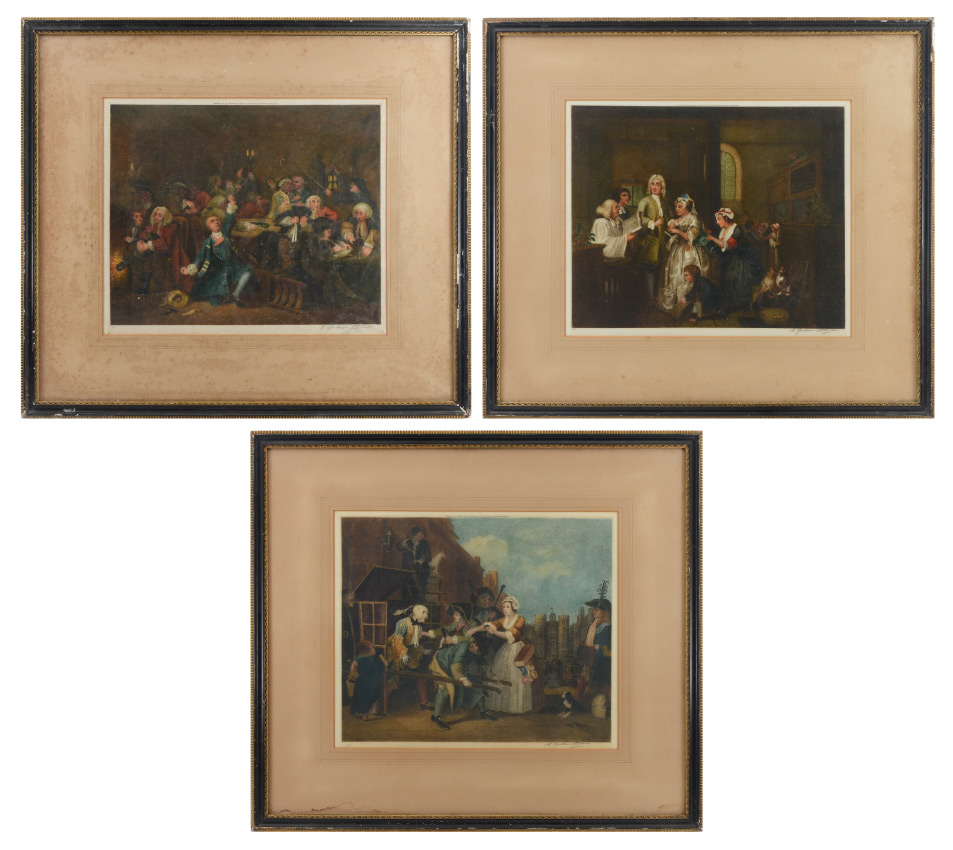 3 E. JACKSON STODART AQUATINT PRINTS: 1) ''Marriage'', sight size, Aquatints, 13.5'' x 16.5'', pencil signed lower right, titled verso, custom ebonized period frame, 23.5'' x 26.25''. 2) ''The Gaming House'' from the Rakes Progress after Hogarth, Aquatint, sight size 14'' x 16.5'', custom ebonized period frame, 23.5'' x 26.25''. Label affixed verso from The Museum Galleries in London. 3) Genre Scene with Aristocrats and Peasants, sight size 14'' x 16.5'', pencil signed lower right, custom ebonized period frame, 23.5'' x 26.25''.