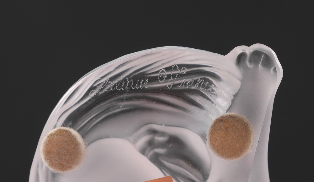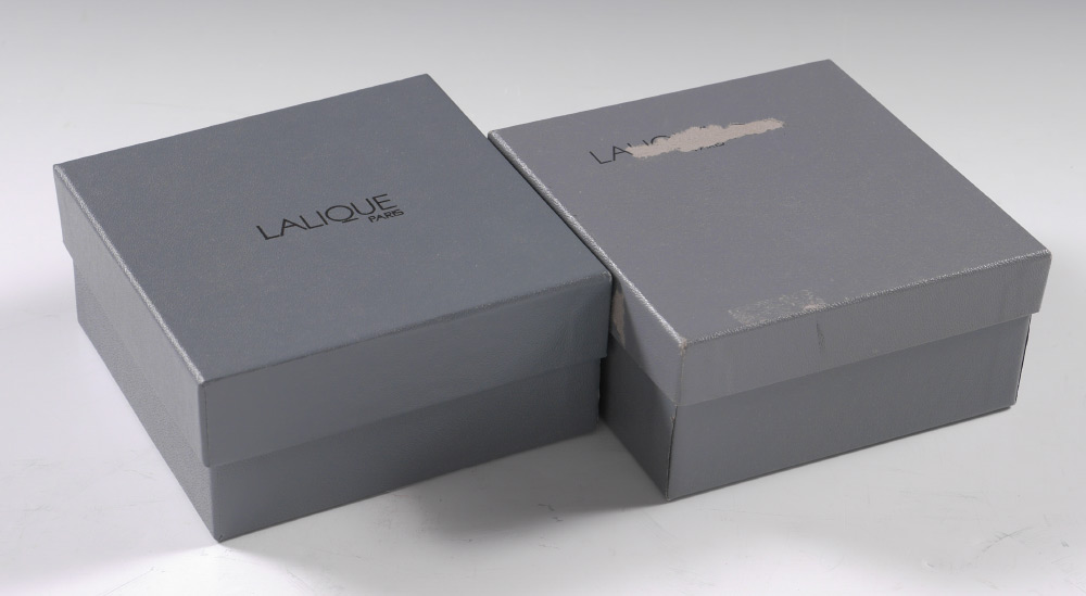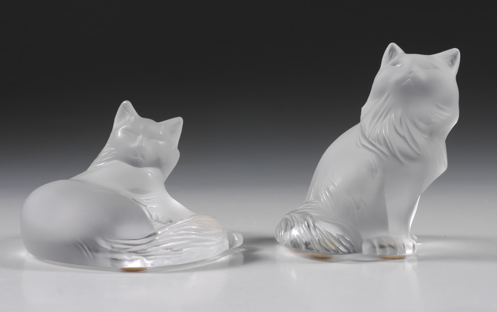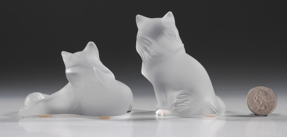 2 LALIQUE CRYSTAL CAT FIGURES: 2 pieces total to include 1) Frosted seated cat, 3 1/4'' h., original box 2 3/4'' h. x 5 1/2'' square. 2) Frosted cat in repose, 3 1/2'' long, original box 2 1/2'' h. x 5 1/4''.