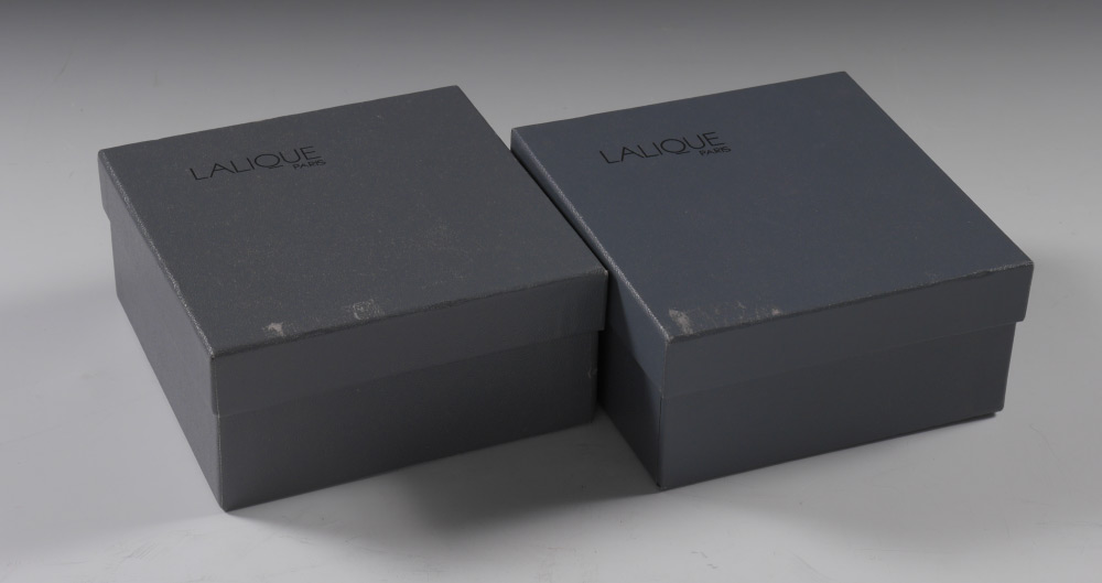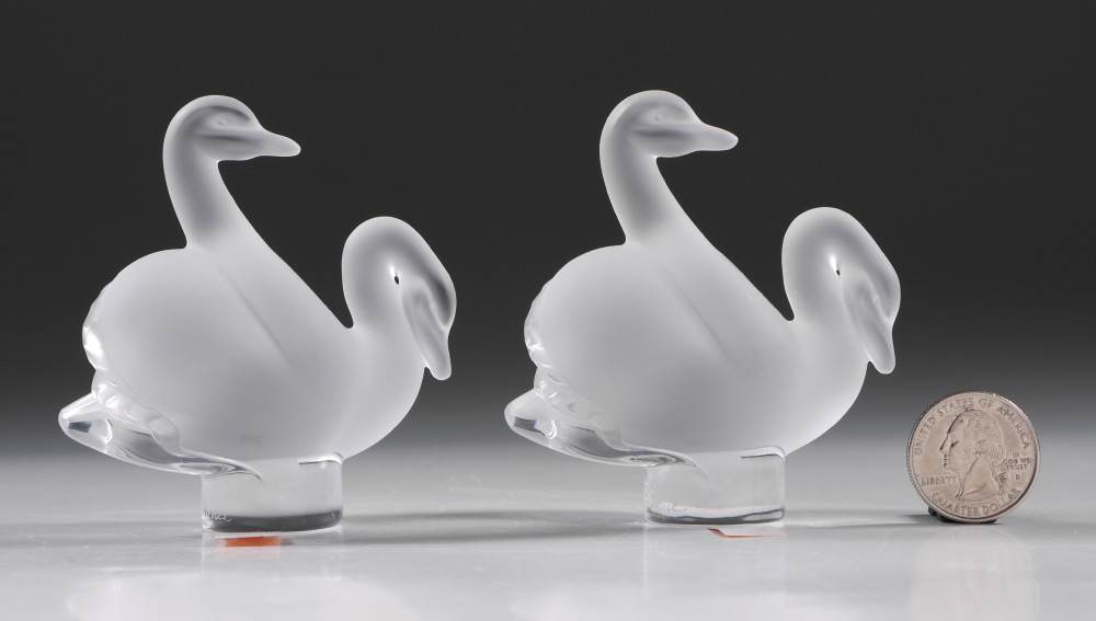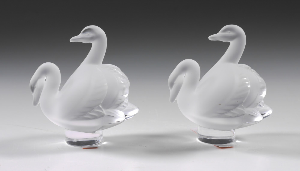 PAIR LALIQUE CRYSTAL CYGNES SWAN PAPERWEIGHTS: Pair frosted glass double swan figures each 3'' h., sold with original boxes 2 1/2'' h. x 5 1/4'' square.