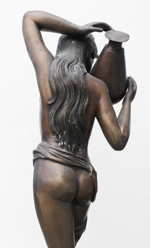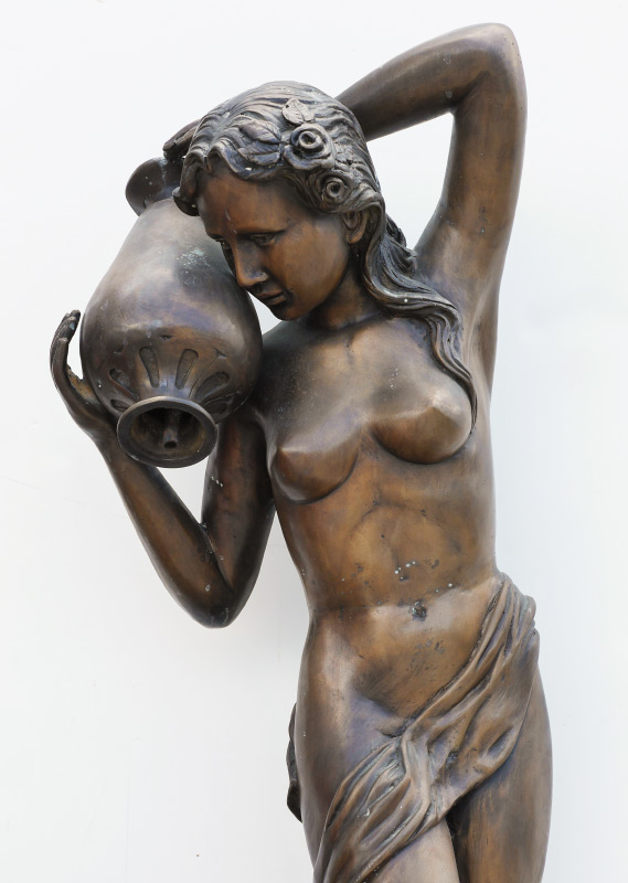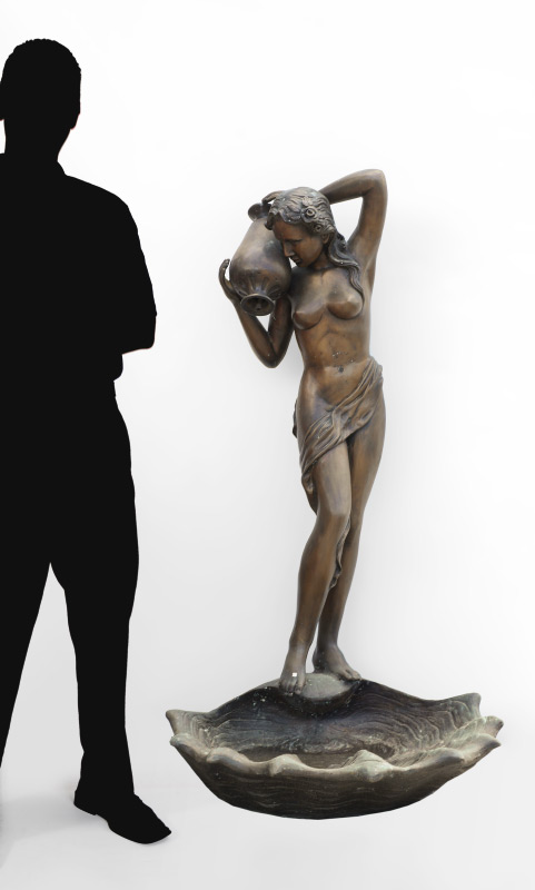LARGE BRONZE NUDE MAIDEN ON SHELL FOUNTAIN: Nearly life size nude maiden holding a vase on her shoulder and standing on a clam shell. No visible signature, no pump. Overall measures 55 1/2'' h. x 30'' x 28''.