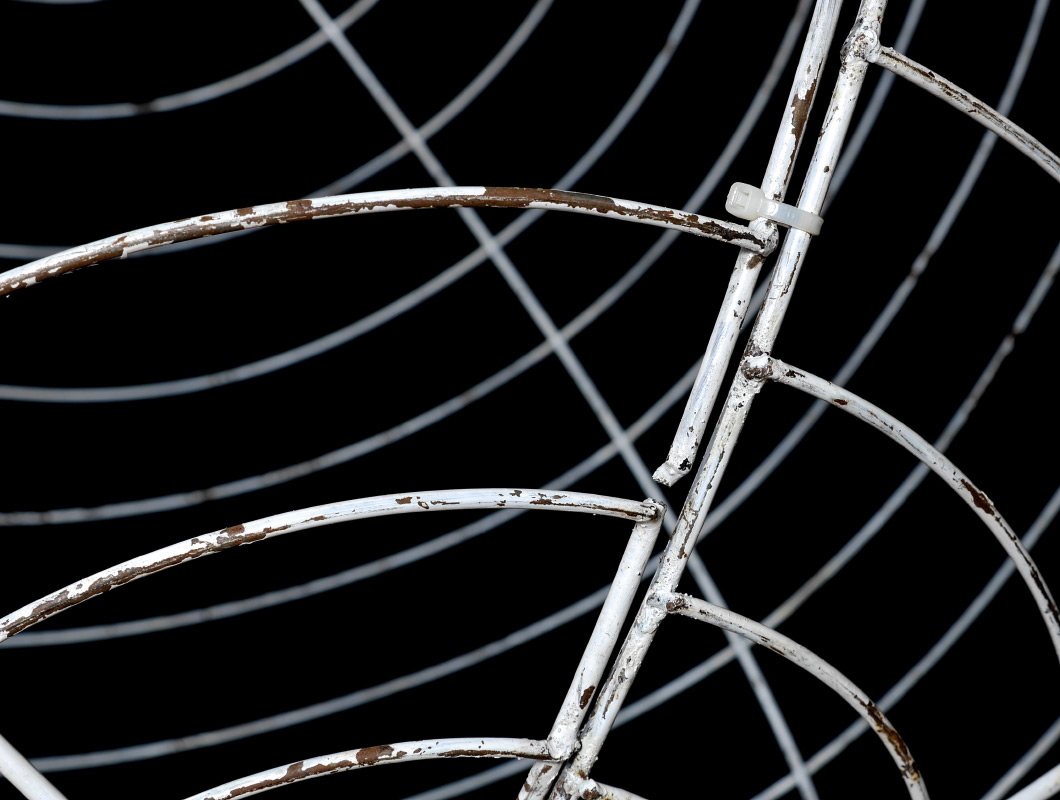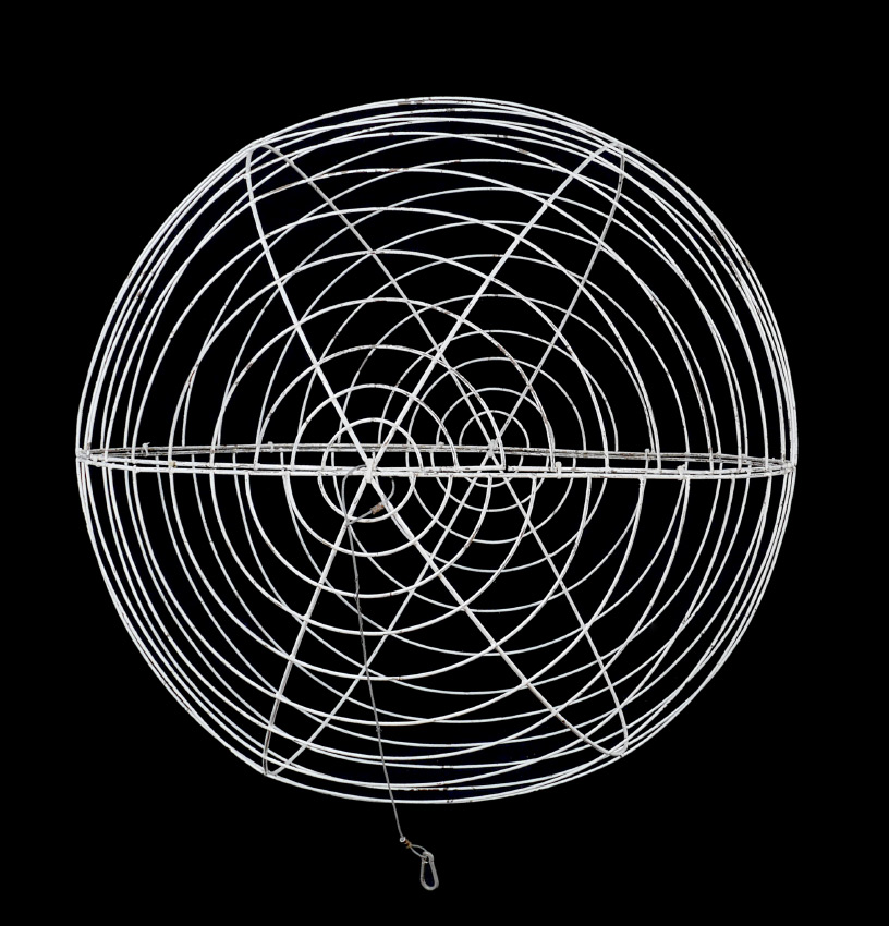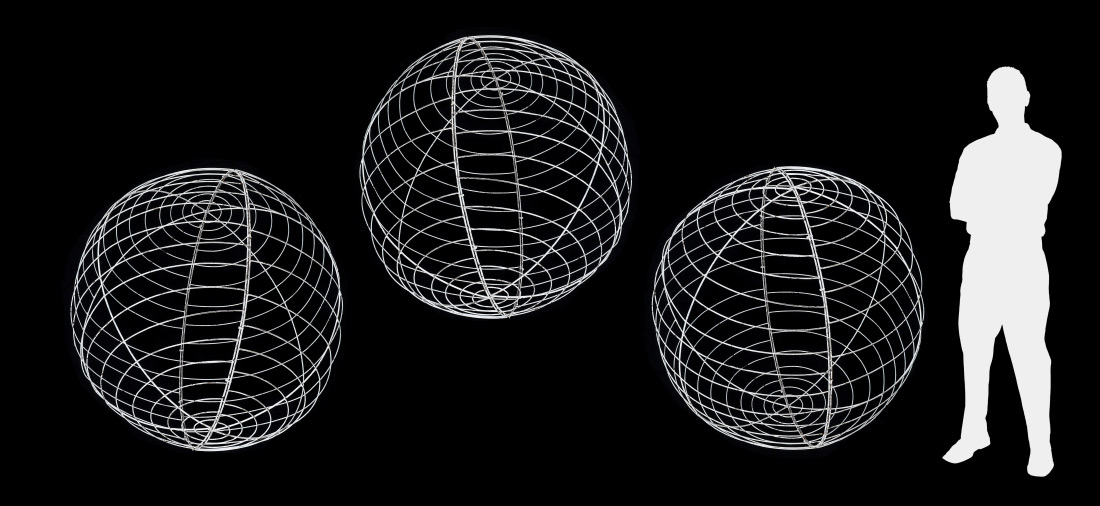 3 LARGE BENT IRON RIBBED SPHERES: Set of 3 open ribbed spheres perfect for use as decoration or as the base for further enhancement. Held together with wire ties, they do separate into half spheres for shipping or storage. White paint over iron, each 48'' dia.