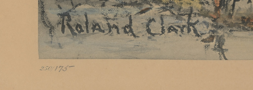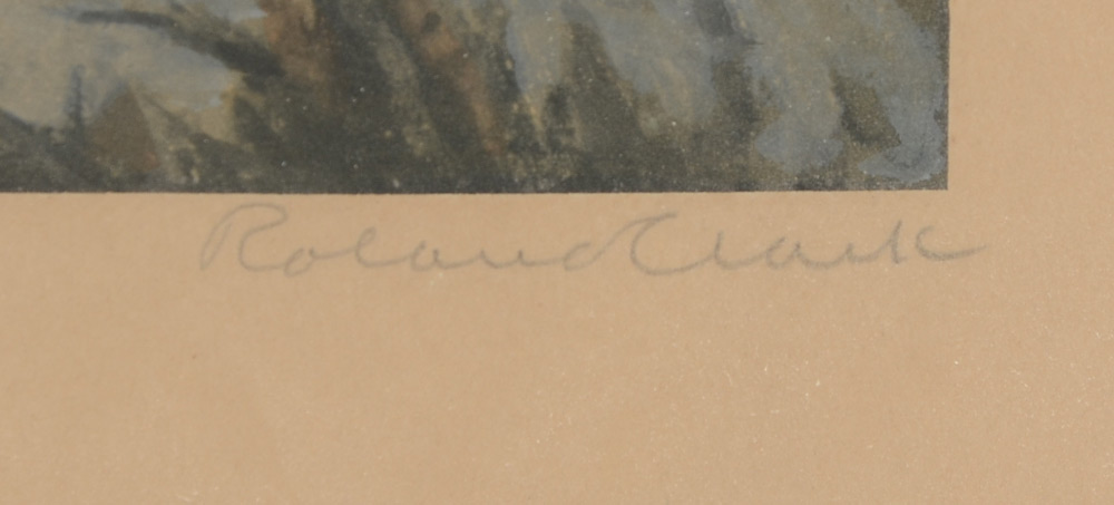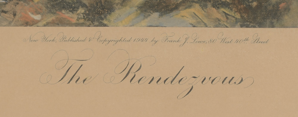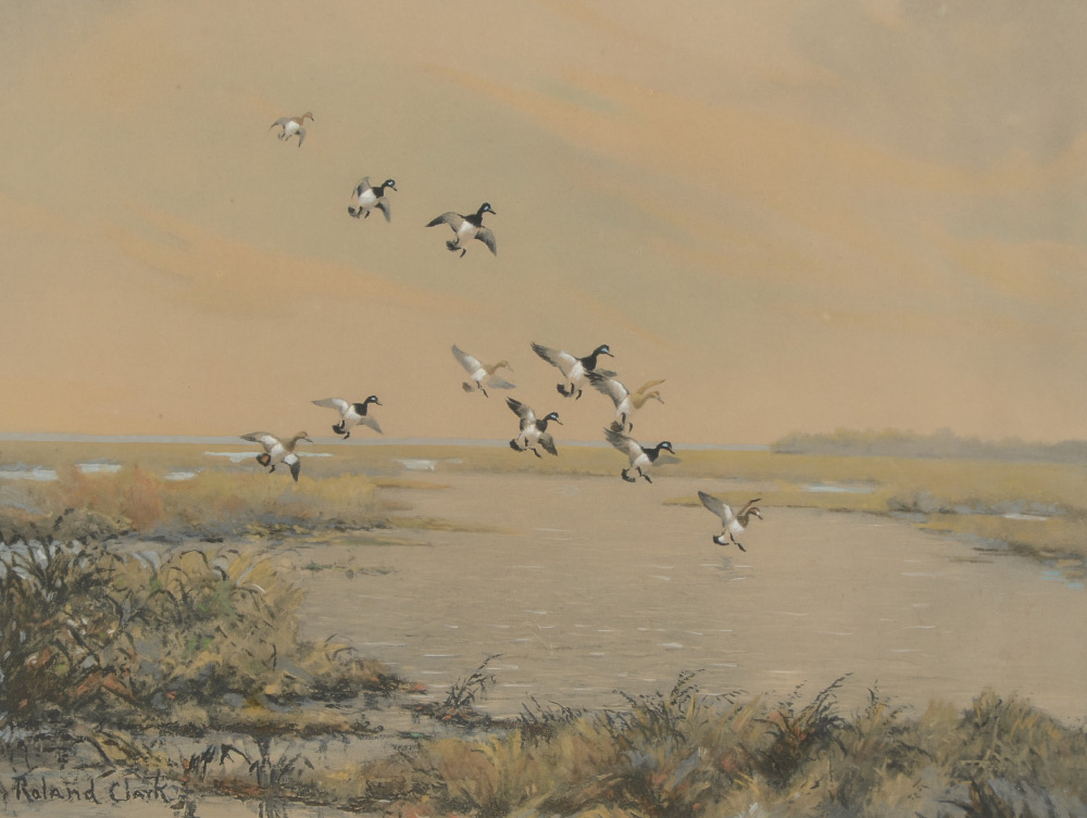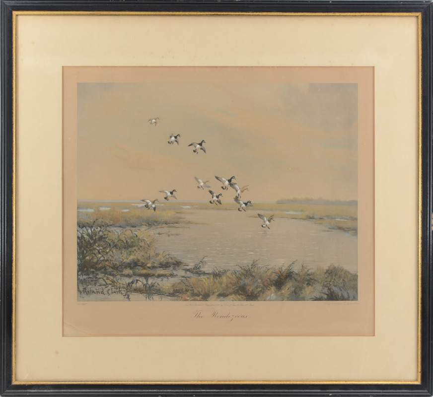 CLARK, Roland, (American, 1874-1957): ''The Rendezvous'', Hand colored Lithograph of Ducks, sight size, 17.5'' x 20.5'', ebonized frame with gilt accent, 25.75'' x 28''. Clark's paintings have garnered international acclaim and he was asked to create the Federal Duck Stamp design. He is also a writer and his book ''Stray Shots'' with etchings has become one of the most valued sporting books of all time.
