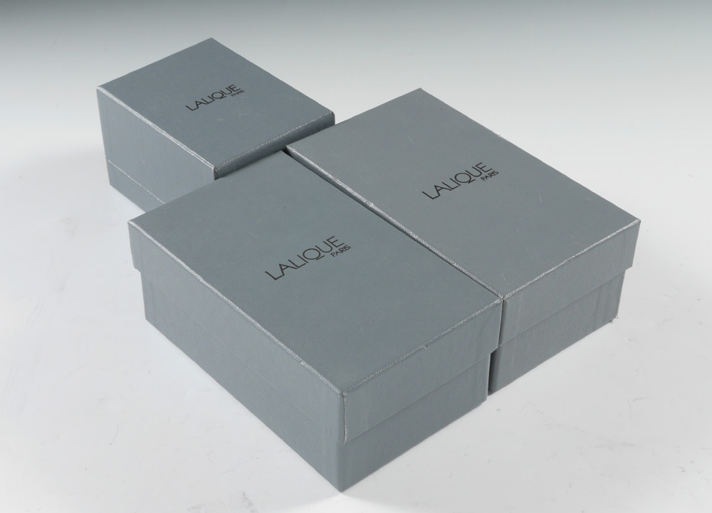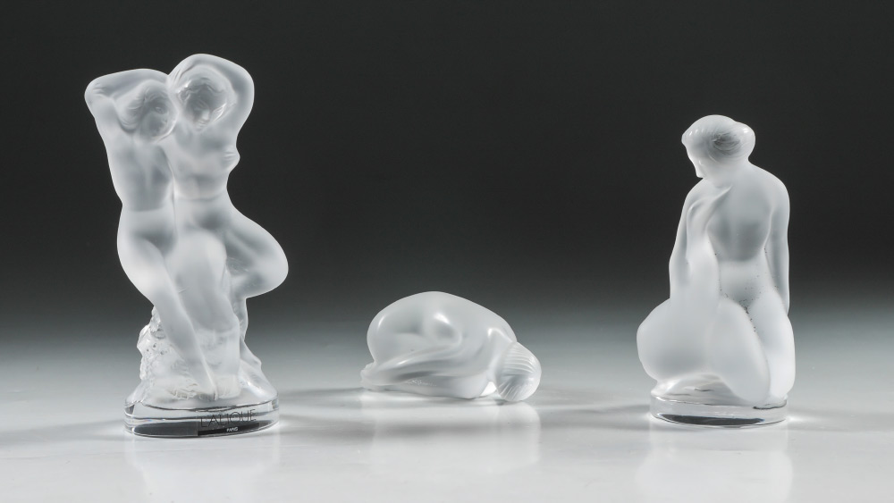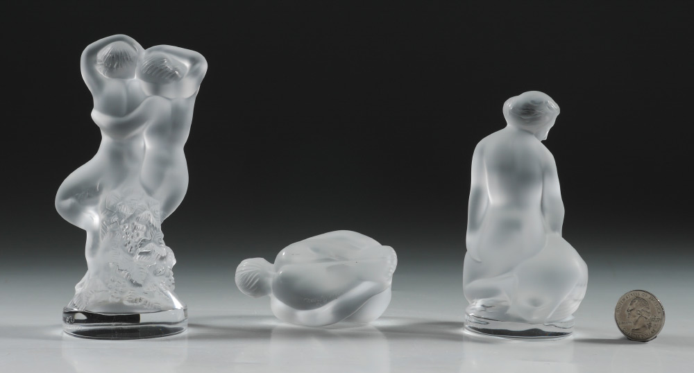 3 LALIQUE CRYSTAL NUDE FIGURES: 3 pieces total to include 1) ''Leda'' woman with swan, 4 1/2'' h., original box 2 3/4'' x 6 3/4'' x 4''. 2) ''Faune'' double nude women, 5 1/2'' h., original box 2 3/4'' h. x 6 3/4'' x 4''. 3) ''Resting'' nude woman, 3'' long, original box 3'' h. x 4 3/4'' x 3 1/2''.