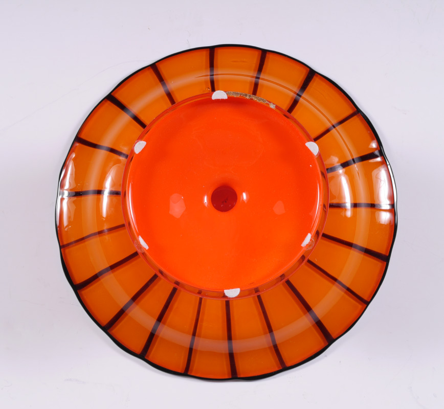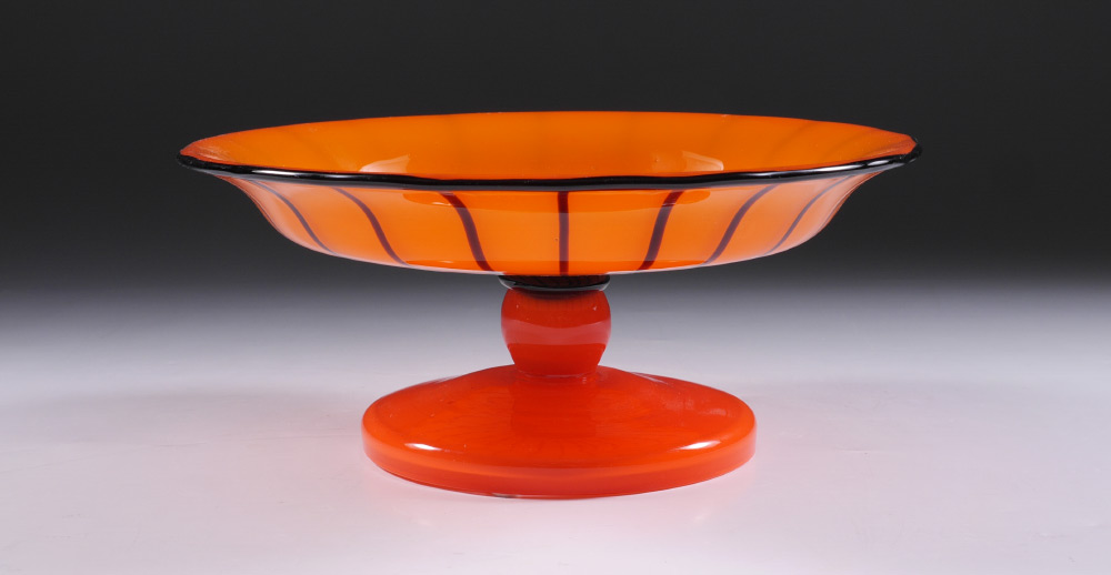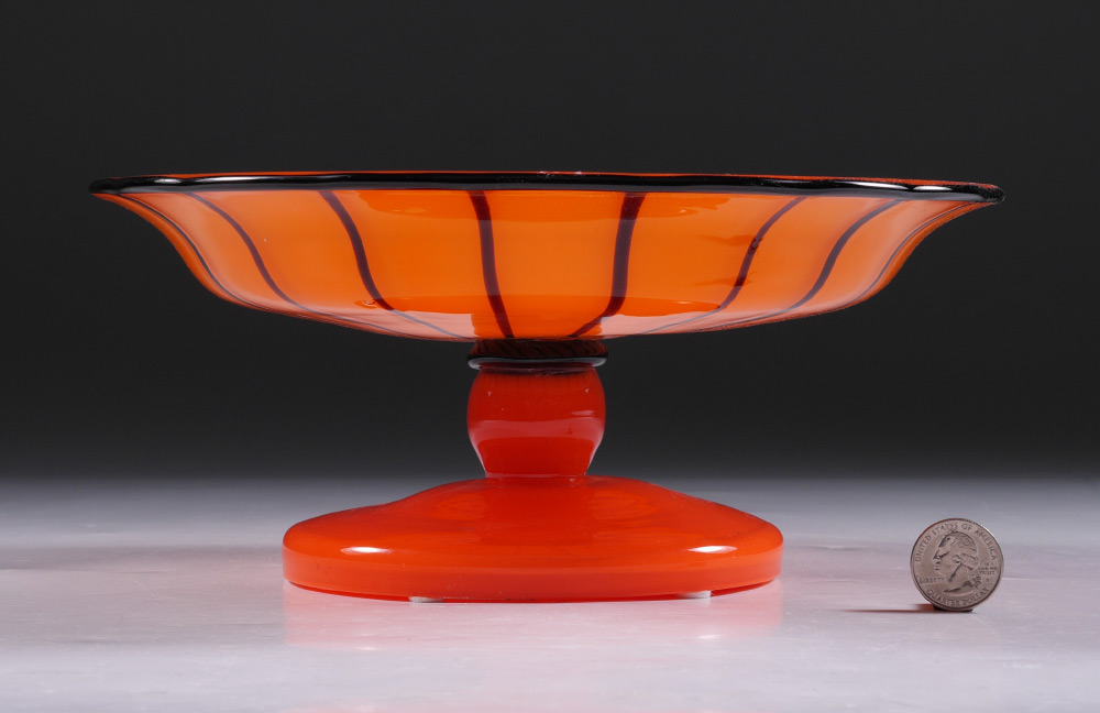 LOETZ ORANGE TANGO ART GLASS COMPOTE: Orange with black stripe decoration, slightly ribbed rim, unmarked, 4 1/2'' h. x 10''.