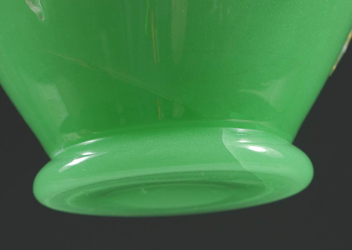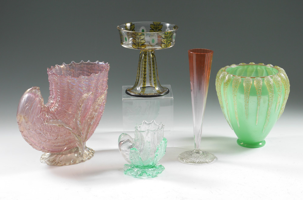 5 PIECE COLLECTION OF BOHEMIAN ART GLASS: Each piece with an issue, to include 1) Large threaded iridescent pink conch shell vase, possible Loetz, 8 1/2'' h. x 10'' x 6''. 2) Small clear and green glass conch shell, 4 1/2'' h. 3) Jade green vase with applied ''tadpole'' decoration, 7 3/4'' h. x 7''. 4) Loetz fluted trumpet vase, unsigned, 10 1/2''. 5) Moser style enameled glass compote, 6 3/4'' h. x 6''.