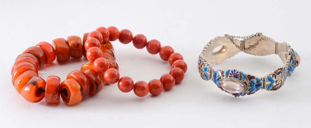 3 BRACELETS: 1) 19 Orangish-Brown stone rondelle disks ranging from 16mm to 20mm. 2) 13 Round Oxblood Coral Beads, 11 MM each in diameter. 3) Oriental Silver paneled bracelet alternating with cabochon cut Quartz stones and pierced panels decorated with cloisonne, blue and purple enamels in bird and flower motifs.