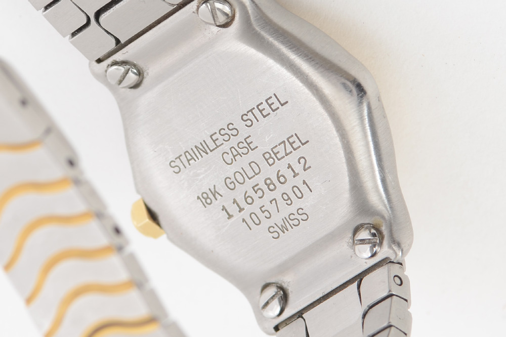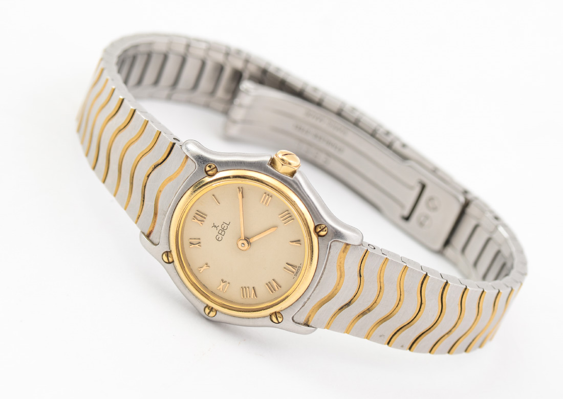 EBEL LADIES CLASSIC WAVE SS & 18K WATCH: Ebel 7'' Ladies' Stainless Steel (SS) and 18K yellow gold Classic Wave Watch with smooth 18K bezel, champagne dial, roman numeral hour markers, sword hands, push/pull crown, stainless steel and 18K yellow gold wave link bracelet and deployment closure.