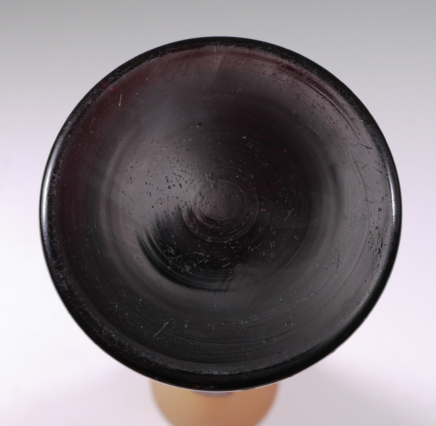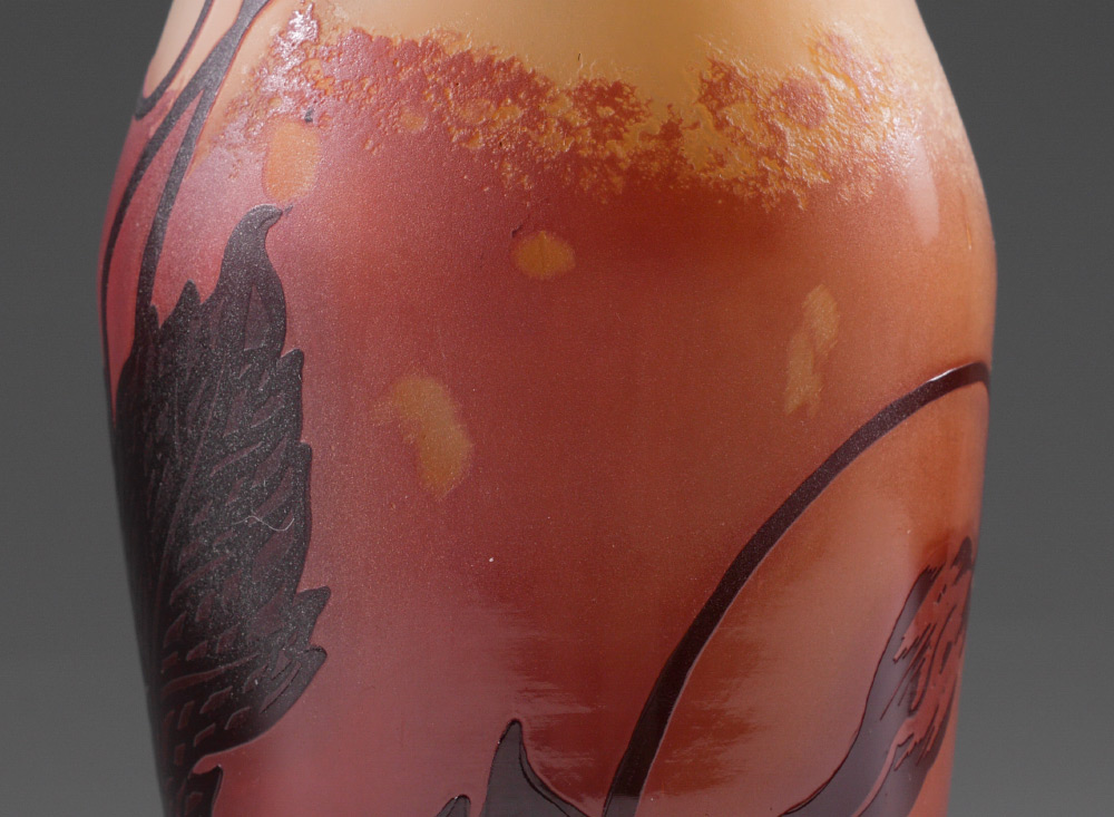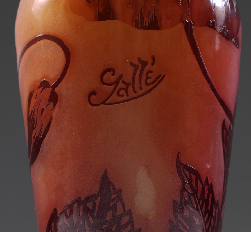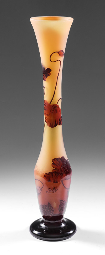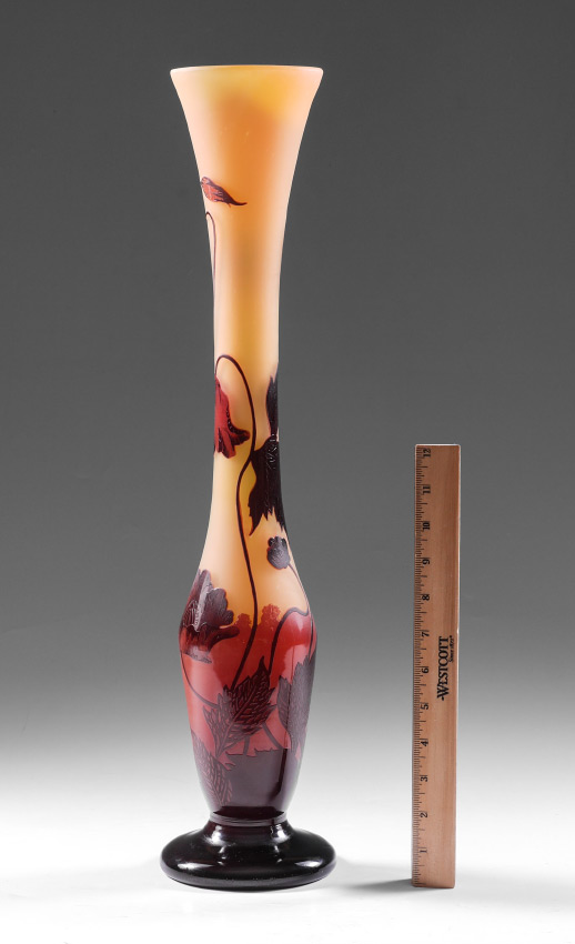 TALL CAMEO GLASS VASE SIGNED GALLE: After Emile Galle, elongated vase with flared rim, cream ground, floral motif, spurious Galle signature. Overall measures 22 1/2'' h. x 5''.