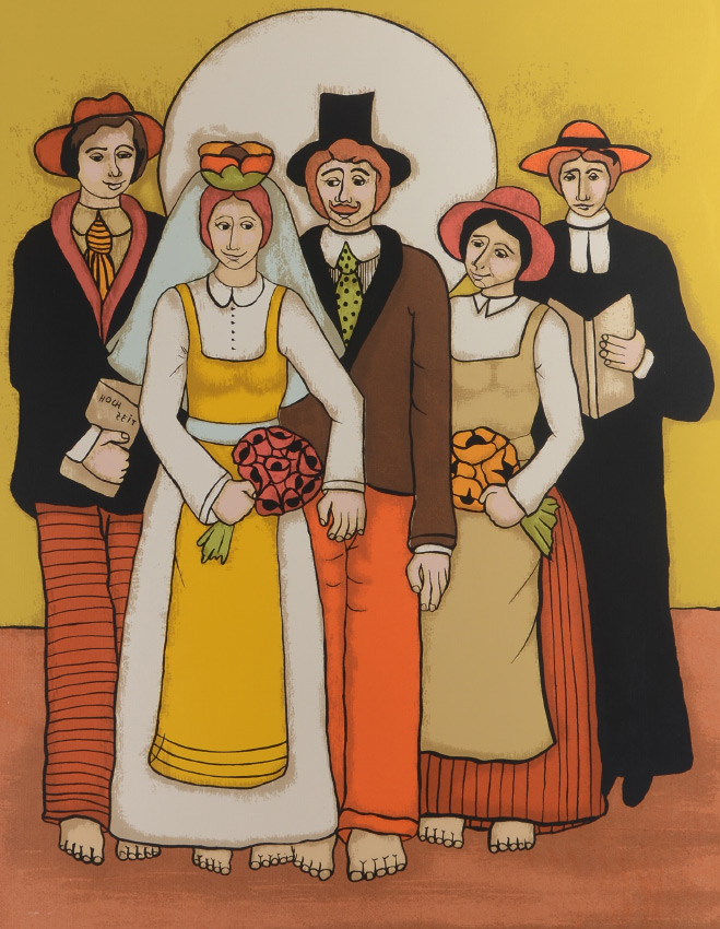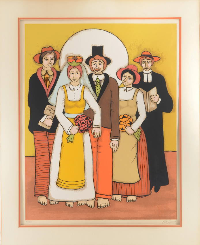 SOMMER, Elke, (German, 1940-): ''Charmingly Rude'' Southern German Bavarian Wedding, Lithograph, sight size 30.5'' x 23.5'', signed lower right, numbered lower left 180/325, framed, 40'' x 34''. Elke Sommer was an actress and an artist. She painted as a hobby until she held her first one-woman show at the MacKenzie Galleries in Beverly Hills.