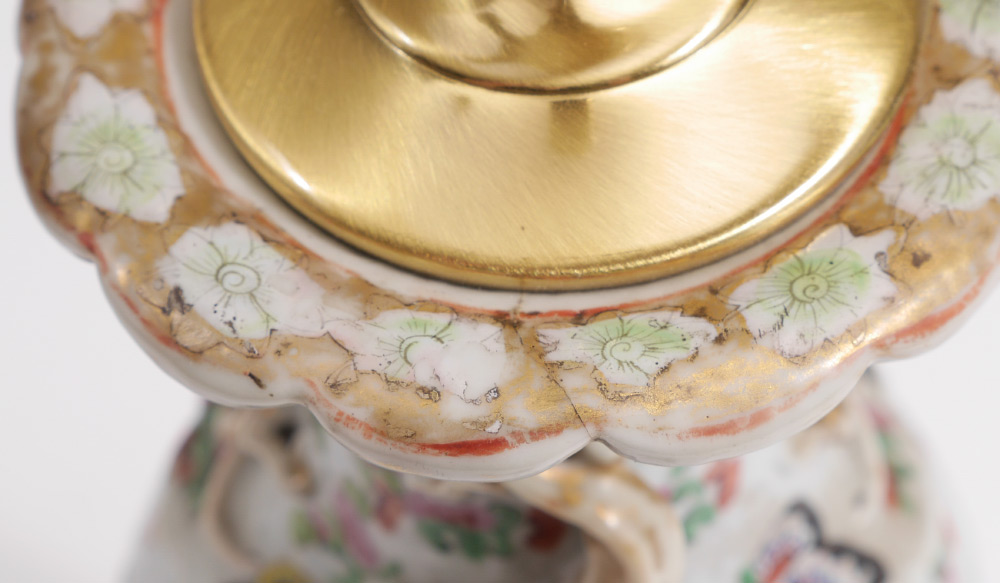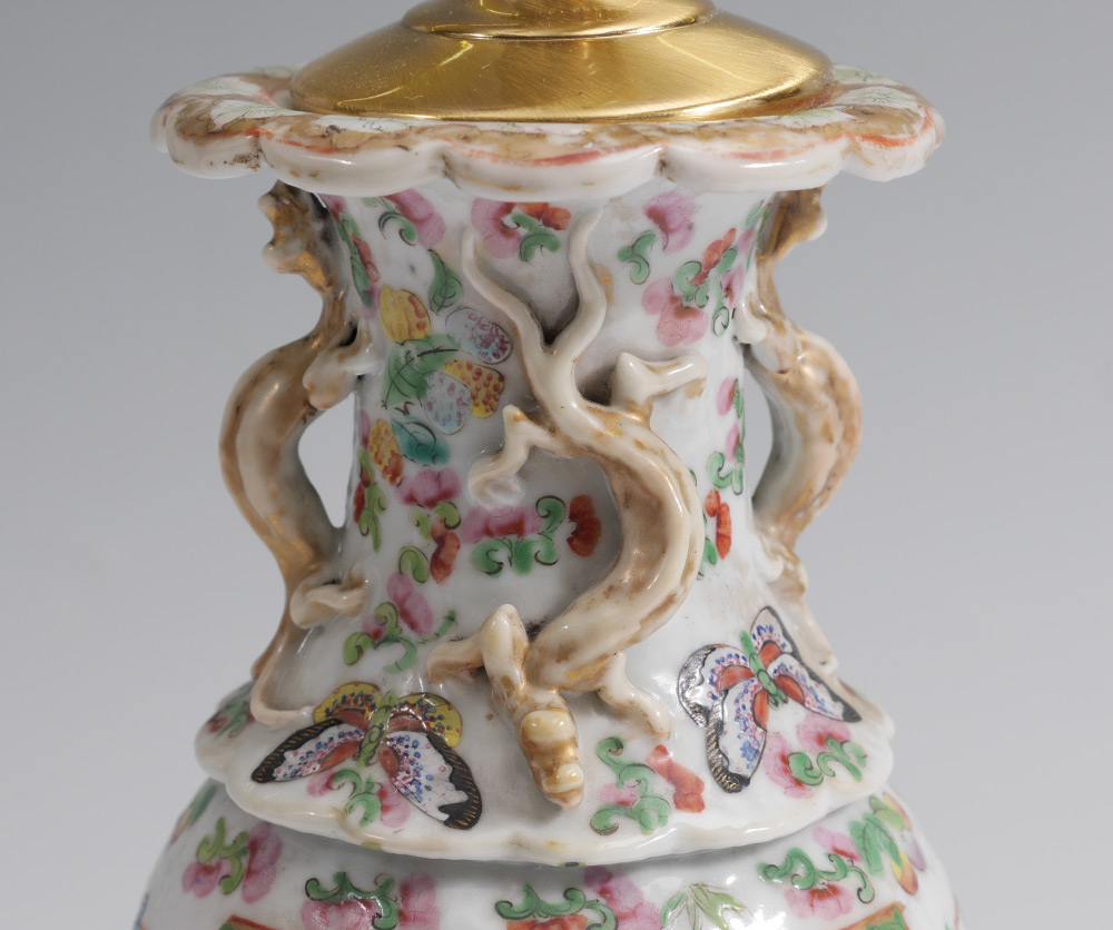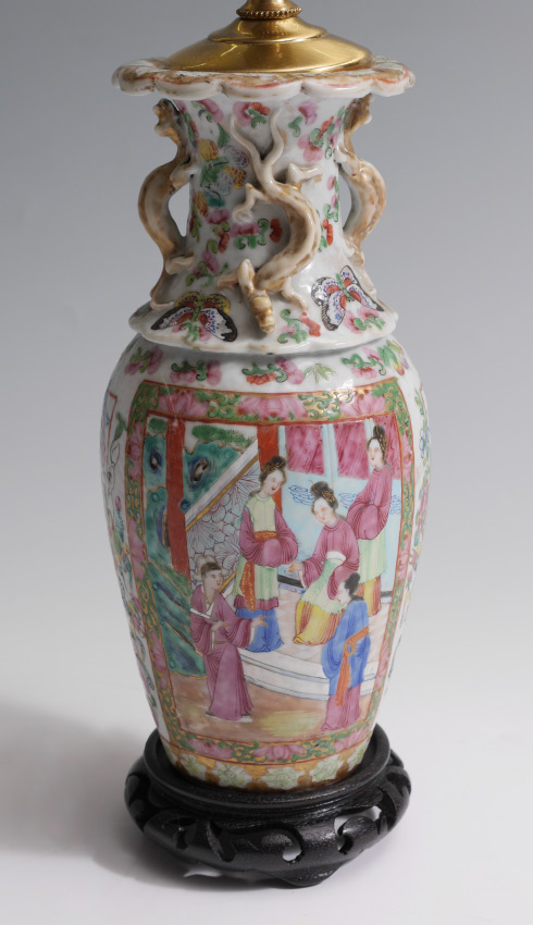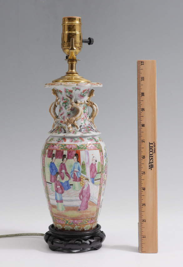 CHINESE ROSE MEDALLION LAMP: Rose medallion decorated vase with carved wood base, single socket fixture, no shade. Overall measures 15'' h. x 4'' base dia.