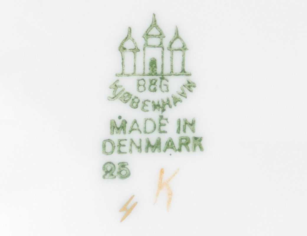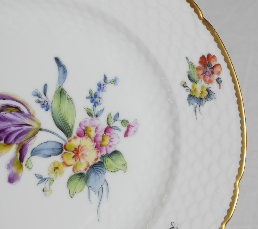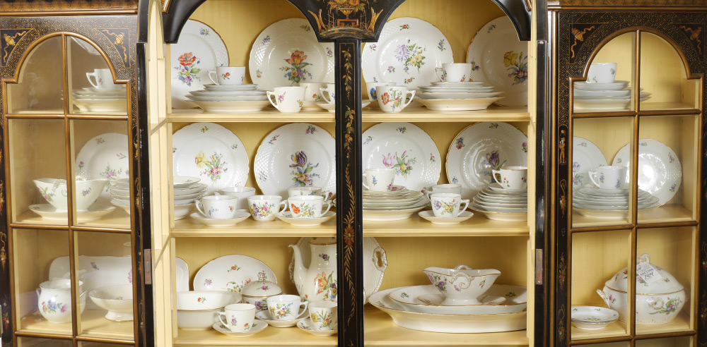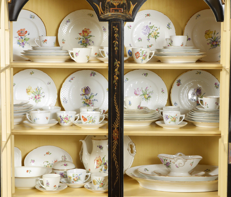 ESTATE BING & GRONDAHL SAXON FLOWER CHINA SERVICE: Approx. 99 pieces in an assembled collection of cream and white background china in the Saxon Flower pattern by Bing & Grondahl with floral and embossed scale design to include 7 cream and 16 white dinner plates (9 1/2''), 2 cream 4 white luncheon plates (8 1/2''), 4 white dessert plates (6 3/4''), 3 cream and 2 white bread plates (6 1/8''), 4 white bowls (9 5/8''), 3 white small low bowls, 5 white underplates (5 3/4''), 7 cream and 15 white teacups, 6 cream and 11 white saucers, 2 white oval platters (larger 20'' x 14''), white covered vegetable (9 1/2'' dia.), 1 cream and 1 white gravy boat, cream open creamer, cream covered sugar, cream teapot (9 1/2'' h.), white open waste bowl, white rectangular condiment (15'' x 6'').