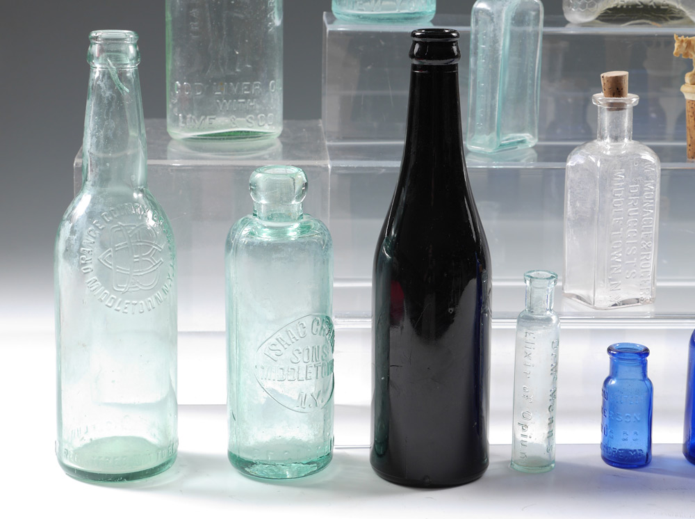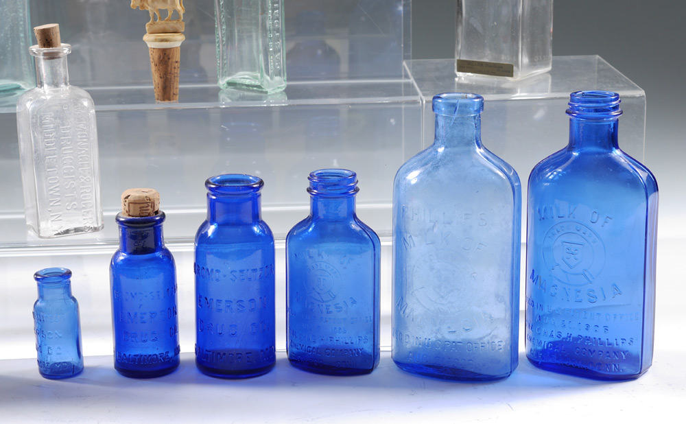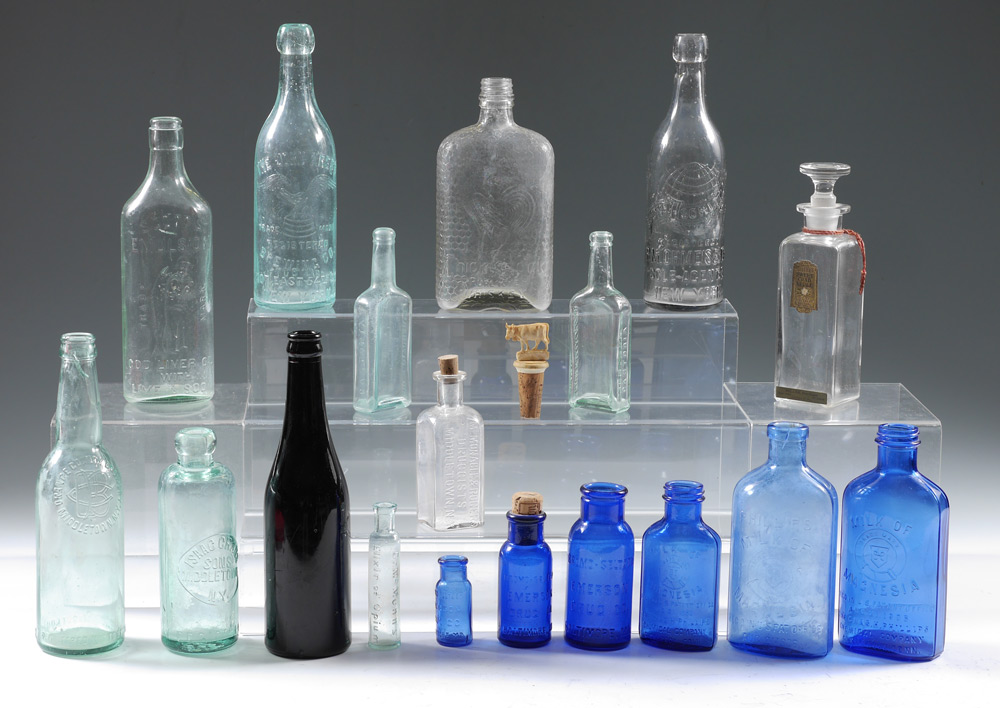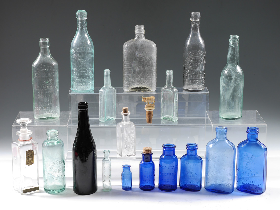 COLLECTION OF ASSORTED ANTIQUE BOTTLES: An assembled collection of 18 bottles to include Chickencock Whiskey, Pabst, bitters, Milk of Magnesia and more. Tallest bottle measures 9 1/4''.