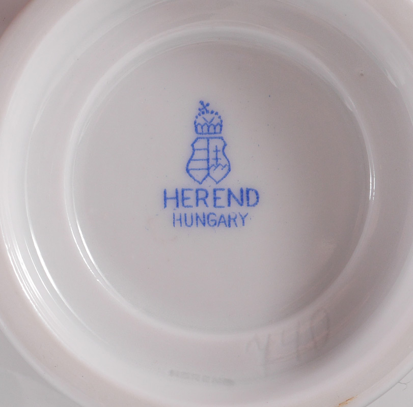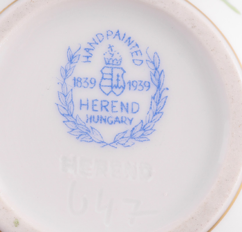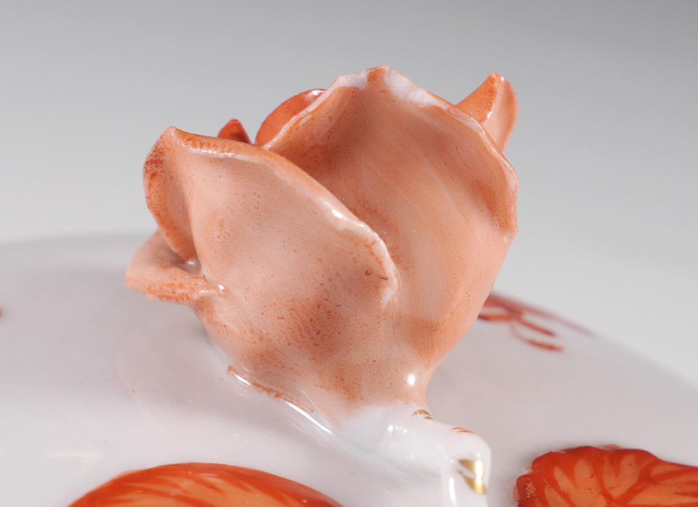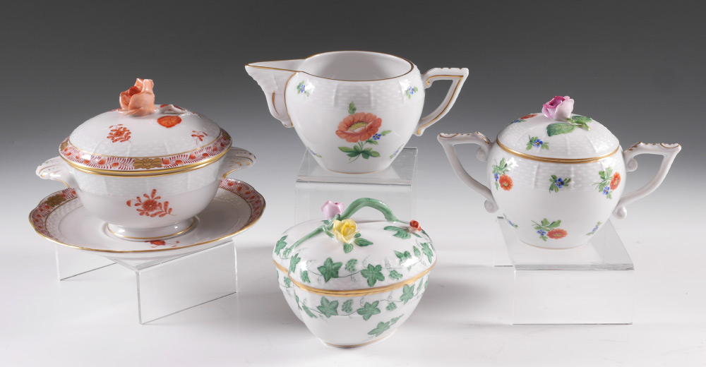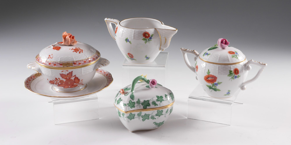 4 PIECE ESTATE HEREND CHINA COLLECTION: 4 pieces total by Herend to include 1-2) Matching open creamer (2 3/4'' h.) and covered sugar with rose finial (6 1/4'' dia.). 3) Covered double handle bowl with rose finial (6'' dia.) and underplate (6 1/4''). 4) Covered heart shaped box with flower finial, 3 1/4'' x 4 1/4''.