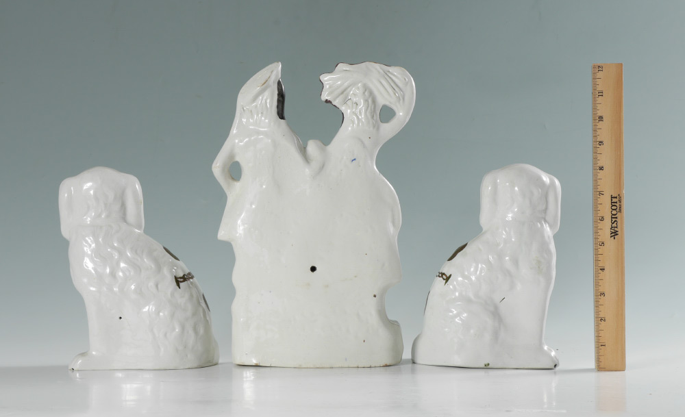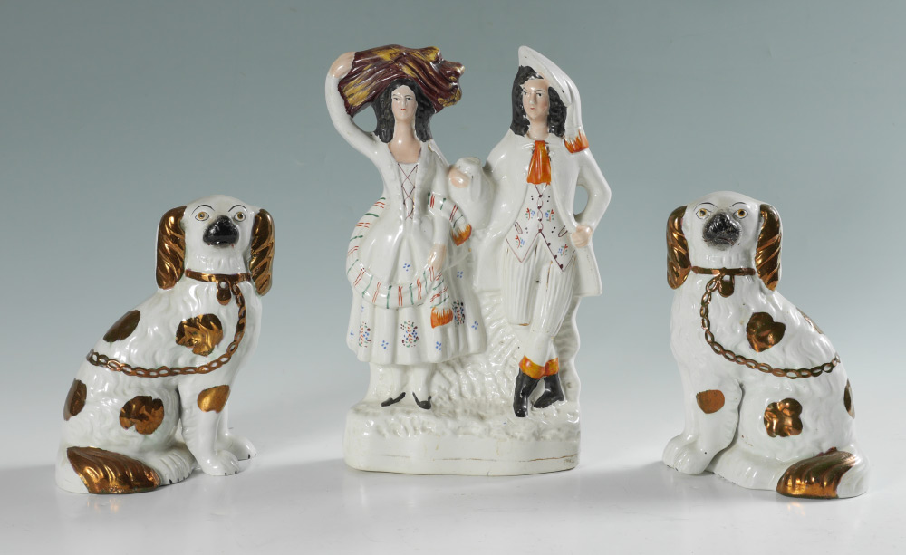 3 PIECE STAFFORDSHIRE DOGS & FIGURAL GROUP: 3 pieces total, unmarked to include 1) Figural group of man holding vase and woman with bundle on her head, 12 1/4'' h. x 8 1/2'' x 2 3/4''. 2-3) Pair of gold decorated dogs, 8 1/4'' h. x 6'' x 3 1/2''.