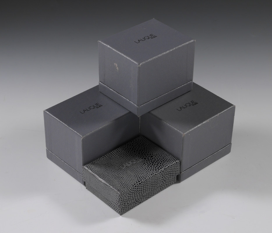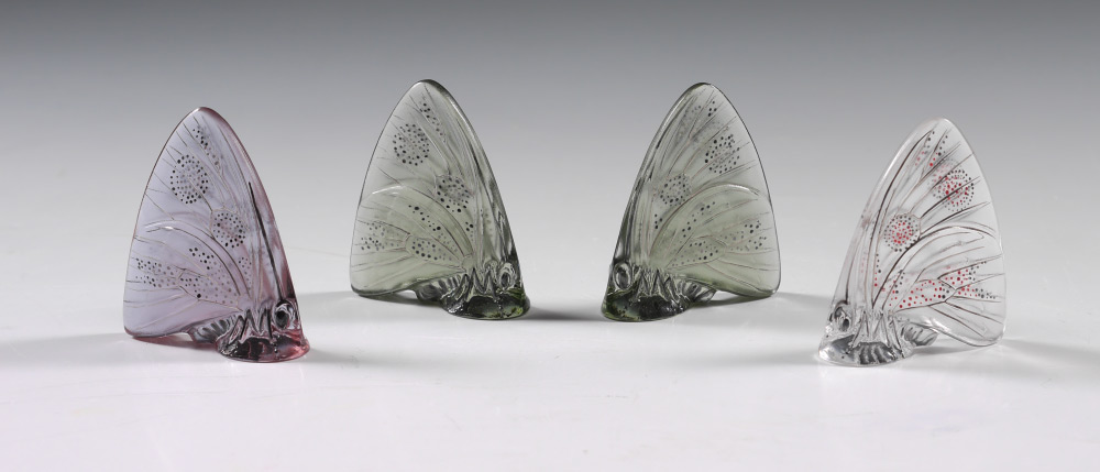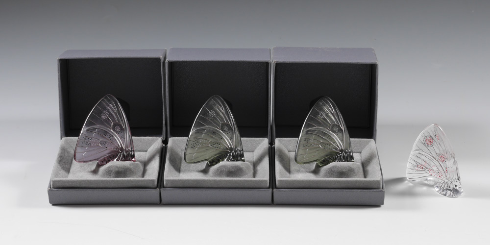 4 LALIQUE CRYSTAL BUTTERFLIES: 2 are smoky crystal, one amethyst and one clear, each measures 2 1/4'' h., 3 sold with original boxes, 2 3/4'' h. x 3 1/4'' x 2 3/4''.
