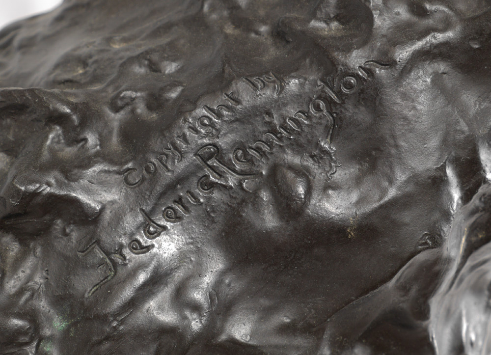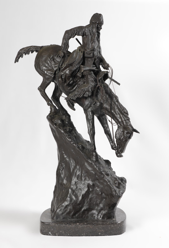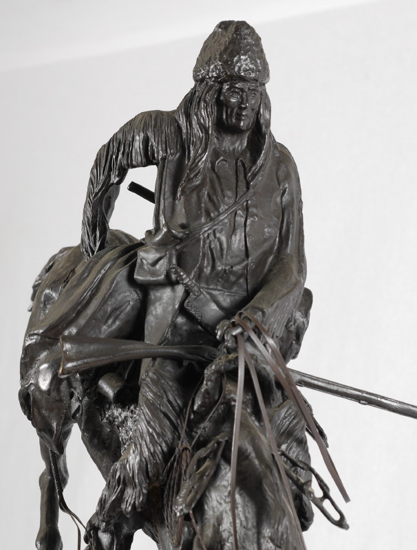 AFTER FREDERIC REMINGTON MOUNTAIN MAN BRONZE: On marble plinth, marked Copyright by Frederic Remington, no foundry mark, measures 28 3/4'' h. x 19 1/4'' x 12''.