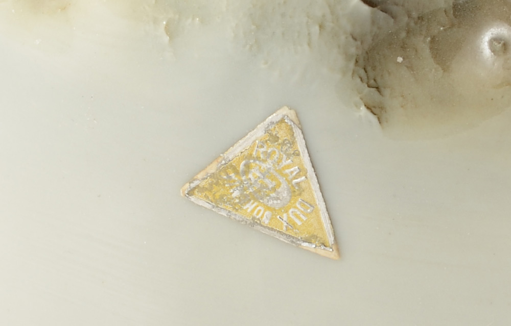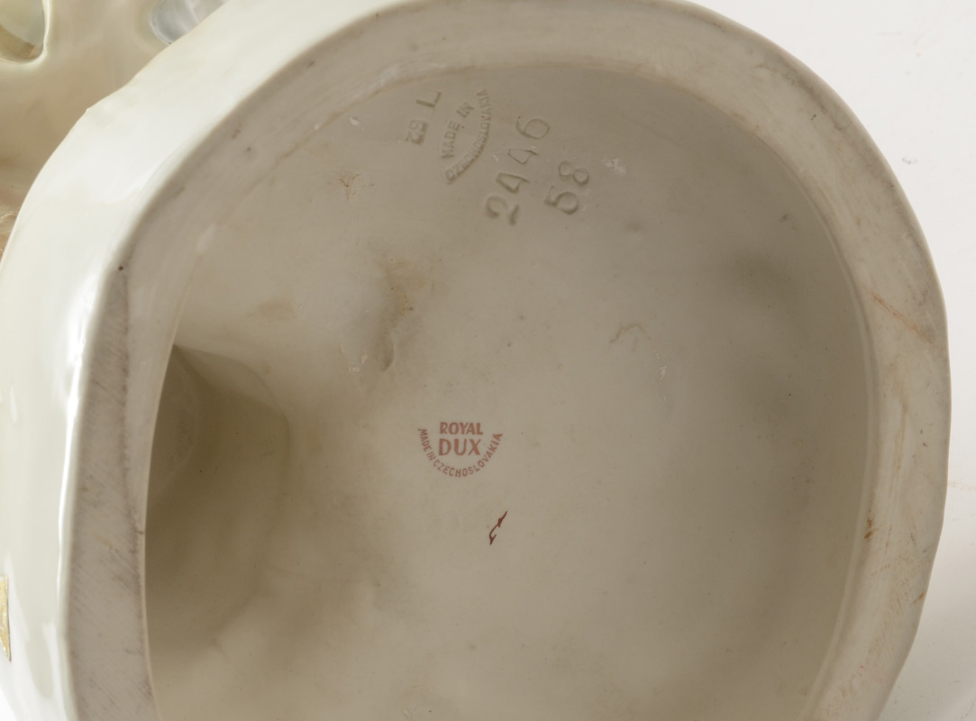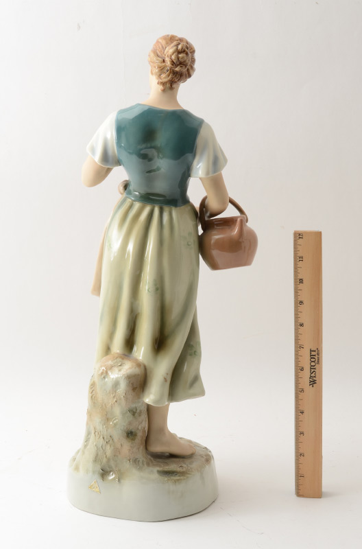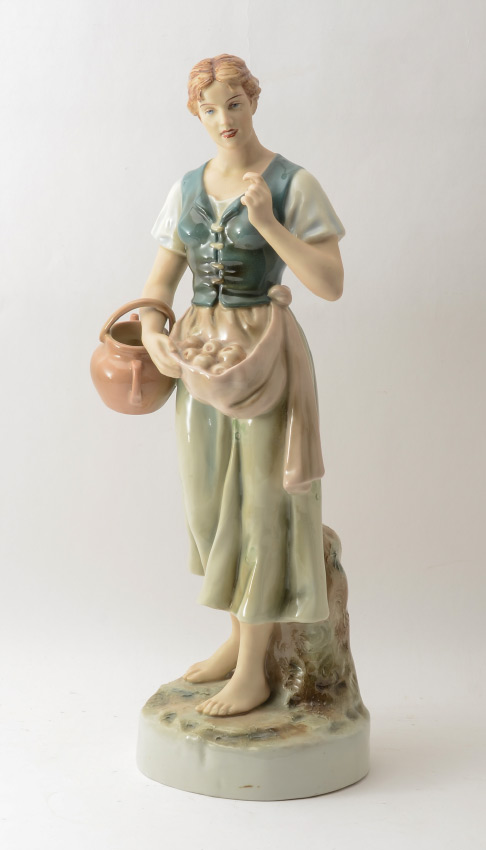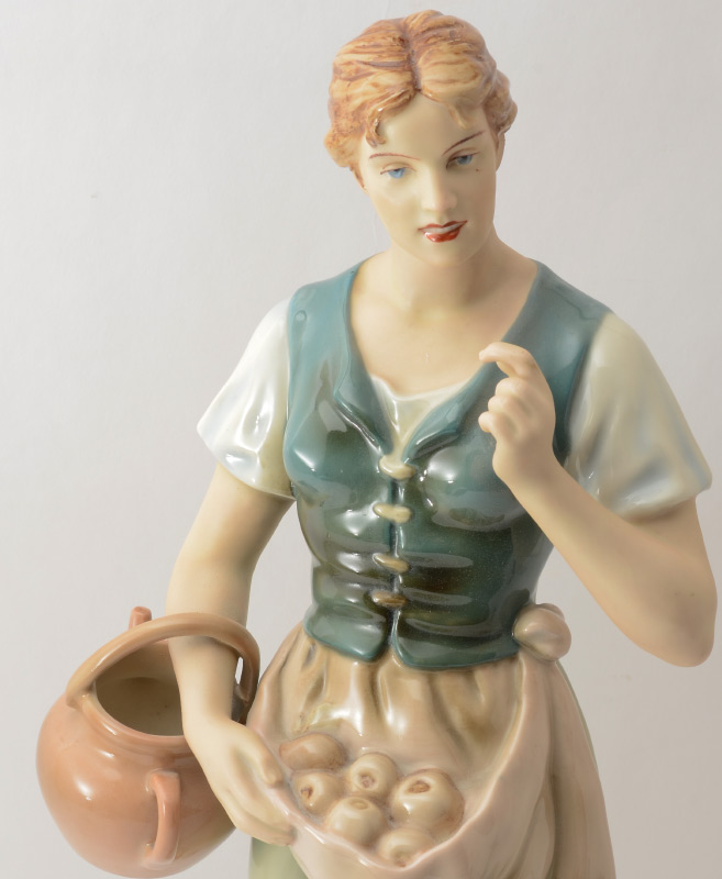 ROYAL DUX FIGURINE OF AN APPLE PICKER: Figure of a maiden holding apples in her smock, and a pitcher on her arm. Well marked inside base, overall measures 20 1/2'' h. x 8''.