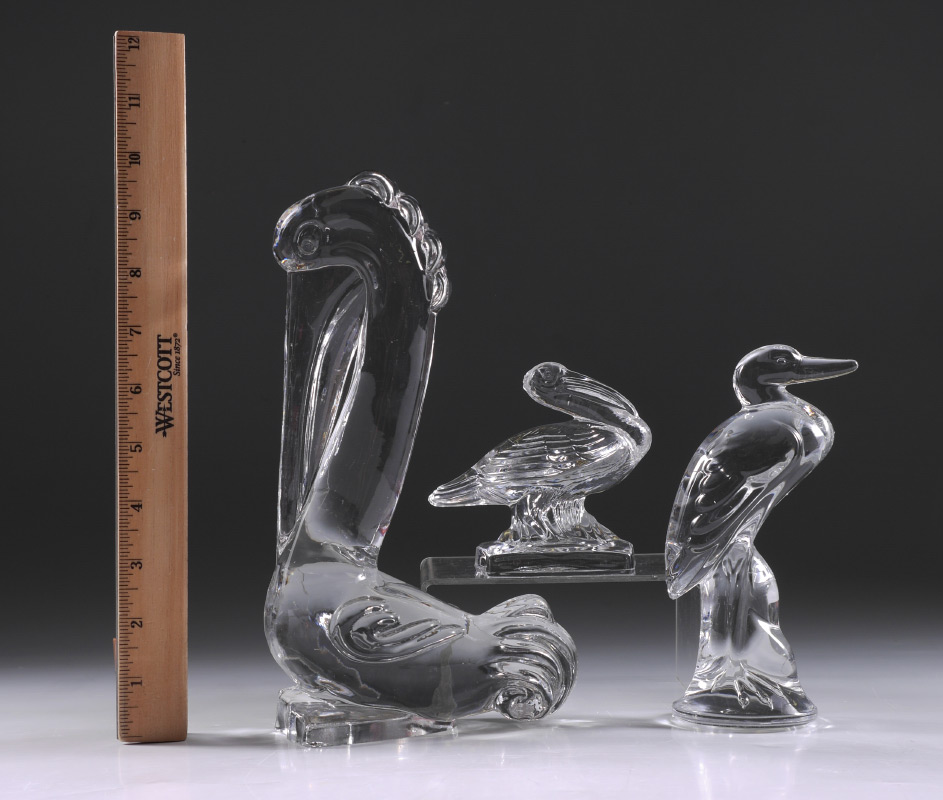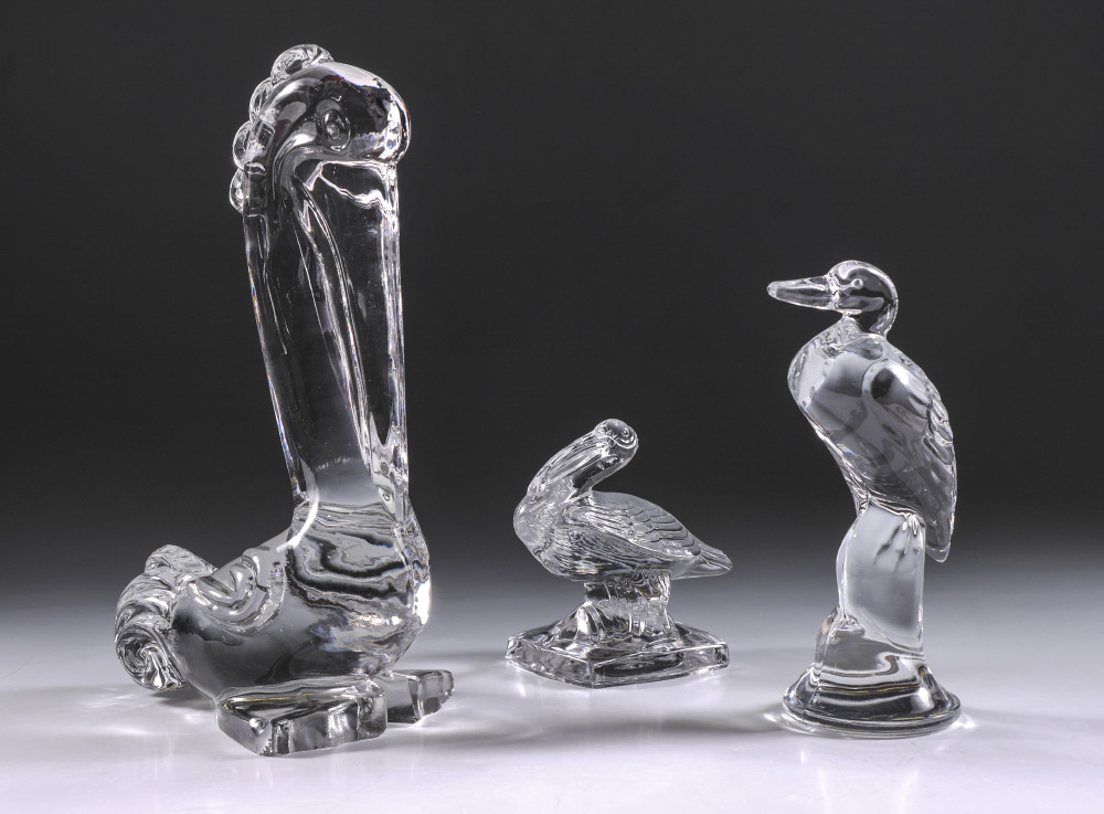 3 PADEN CITY, FOSTORIA & DUNCAN CRYSTAL BIRDS: 3 pieces total to include 1) Large Paden City Glass Co Crystal Barth Art Pelican, 9 3/4'' h. x 4 1/2'' x 5 1/4''. 2) Fostoria Glass Co Crystal Pelican #2531, 4'' h. 3) Duncan Glass Co Crystal Heron, 6 3/4'' h.
